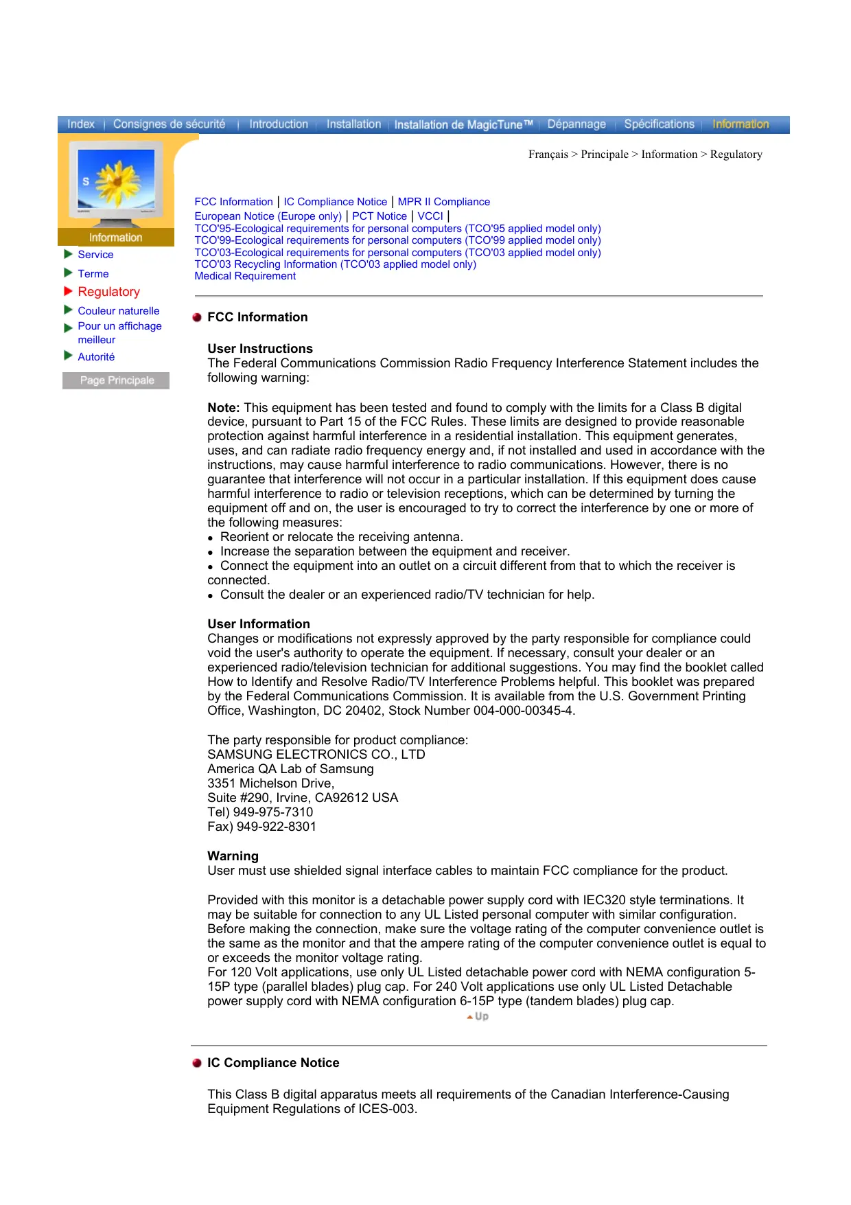 America QA Lab of Samsung 3351 Michelson Drive, Suite #290, Irvine, CA92612 USA Tel) 949-975-7310 Fax) 949-922-8301 Warning User must use shielded signal interface cables to maintain FCC compliance for the product. Provided with this monitor is a detachable power supply cord with IEC320 style terminations. It may be suitable for connection to any UL Listed personal computer with similar configuration. Before making the connection, make sure the voltage rating of the computer convenience outlet is the same as the monitor and that the ampere rating of the computer convenience outlet is equal to or exceeds the monitor voltage rating. For 120 Volt applications, use only UL Listed detachable power cord with NEMA configuration 515P type (parallel blades) plug cap. For 240 Volt applications use only UL Listed Detachable power supply cord with NEMA configuration 6-15P type (tandem blades) plug cap. IC Compliance Notice This Class B digital apparatus meets all requirements of the Canadian Interference-Causing Equipment Regulations of ICES-003. Cet appareil Numérique de classe B respecte toutes les exigences du Règlemont NMB-03 sur les équipements produisant des interférences au Canada. MPR II Compliance This monitor complies with SWEDAC(MPR II) recommendations for reduced electric and magnetic fields. European Notice(Europe Only) Products with the CE marking comply with the EMC Directive(89/336/EEC), (92/31/EEC), (93/68/EEC) and the Low Voltage Directive (73/23/EEC) issued by the Commission of the European Community. Compliance with these directives implies conformity to the following European Norms: