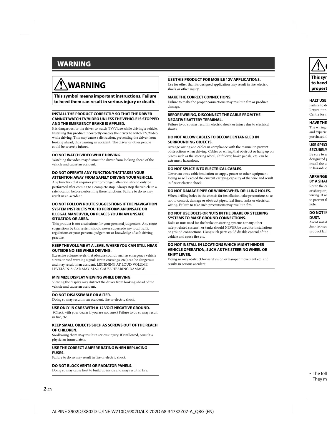 1-EN ALPINE X902D/X802D-U/INE-W710D/i902D/iLX-702D 68-34732Z07-A_QRG (EN) WARNING