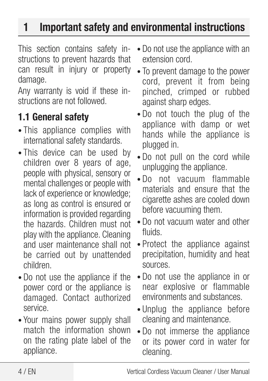 • Votre alimentation secteur doit correspondre aux informations figurant sur la plaque signalétique de l'appareil. • N’utilisez pas l’appareil avec une rallonge. • Pour éviter d'endommager le cordon d'alimentation, évitez qu'il soit pincé, serti ou frotté contre des arêtes vives. • Ne touchez pas la fiche de l’appareil avec les mains mouillées ou humides lorsque l’appareil est branché. • Ne tirez pas le cordon pour débrancher l’appareil. • N’aspirez pas les matériaux inflammables et assurez-vous que les cendres de cigarette sont refroidies avant de les aspirer. • N’aspirez pas d’eau et d’autres liquides. • Protégez l’appareil de la pluie, de l’humidité et des sources de chaleur. • N’utilisez pas l’appareil dans ou à proximité d’environnements