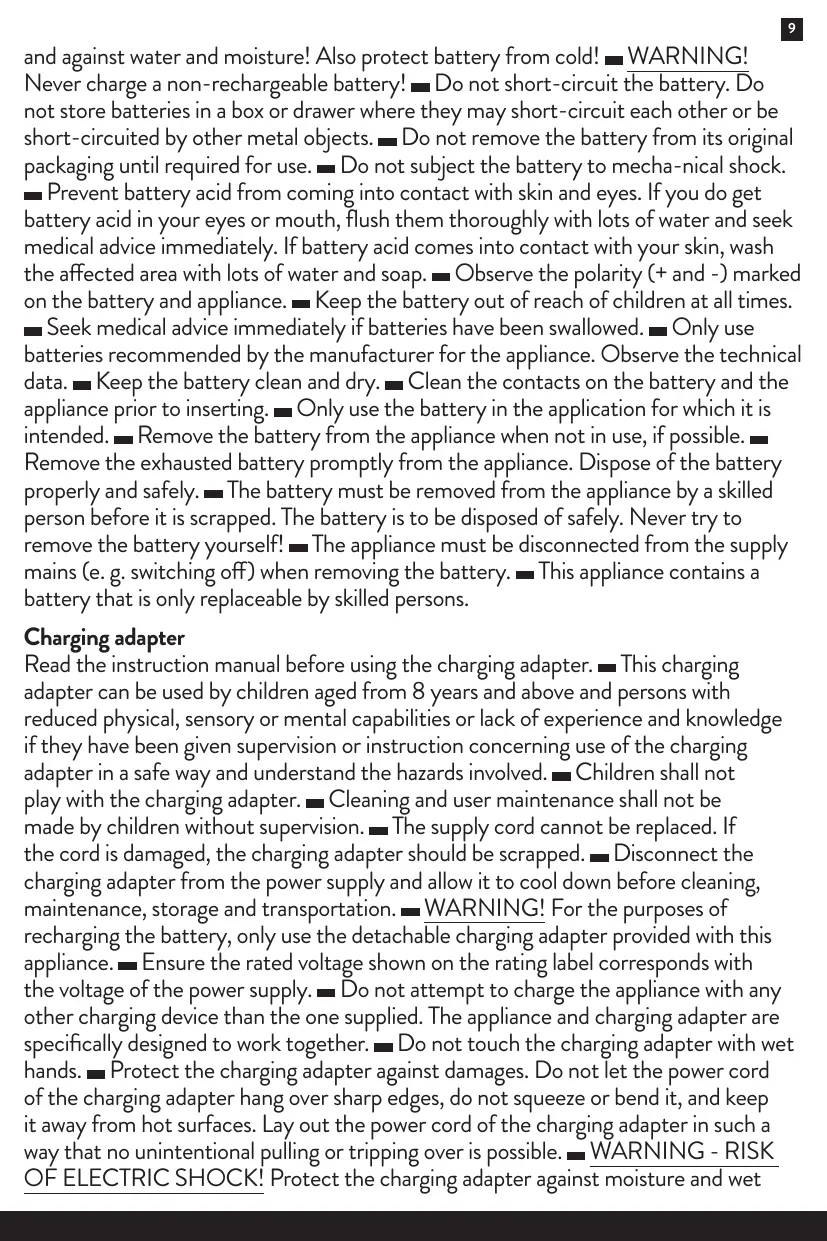 (+ et -) indiquée sur la batterie et l’appareil. Rangez toujours la batterie hors de portée des enfants. Toute personne ayant avalé une pile doit consulter un médecin immédiatement. Utilisez uniquement les piles recommandées par le fabricant pour cet appareil. Respectez les données techniques. Gardez la batterie propre et sèche. Nettoyez les contacts sur l’appareil et la batterie avant de l’installer. N’utilisez la batterie que pour l’application pour laquelle elle est destinée. Retirez la batterie de l’appareil lorsque vous ne l’utilisez pas. Sortez la batterie vide de l’appareil sans attendre. Éliminez la batterie correctement et en toute sécurité. La batterie doit être retirée de l’appareil par une personne qualifiée avant sa mise au rebut. La batterie doit être éliminée en toute sécurité. N’essayez jamais de retirer la batterie vous-même ! L’appareil doit être débranché du secteur (par exemple éteint) lors du retrait de la batterie. Cet appareil contient une batterie qui ne peut être remplacée que par des personnes qualifiées. Adaptateur de charge Lisez le mode d’emploi avant d’utiliser l’adaptateur de charge. Cet adaptateur de charge peut être utilisé par des enfants âgés d’au moins 8 ans et par des personnes ayant des capacités physiques, sensorielles ou mentales réduites ou dénuées d’expérience ou de connaissance, s’ils (si elles) sont correctement surveillé(e)s ou si des instructions relatives à l’utilisation de l’appareil en toute sécurité leur ont été données et si les risques encourus ont été appréhendés. Les enfants ne doivent pas jouer avec l’adaptateur de charge Le nettoyage et l’entretien par l’usager ne doivent pas être effectués par des enfants sans surveillance Le câble d’alimentation ne peut pas être remplacé. Si le câble est endommagé, il convient de mettre l’appareil au rebut. Débranchez l’adaptateur de charge de la source d’alimentation et laissez-le refroidir avant tout nettoyage, entretien, stockage et transport. AVERTISSEMENT Pour recharger la batterie, utilisez uniquement l’adaptateur de charge amovible fourni avec cet appareil. Assurez-vous que la tension indiquée sur la plaque signalétique correspond à celle de la prise secteur utilisée. N’essayez pas de charger l’appareil avec un dispositif de charge autre que celui fourni. L’appareil et l’adaptateur de charge sont spécialement conçus pour fonctionner ensemble. Ne touchez pas l’adaptateur de charge avec les mains mouillées. Protégez l’adaptateur de charge contre les dommages. Ne laissez pas le cordon d’alimentation de l’adaptateur de charge pendre au-dessus de bords tranchants, ne le serrez pas ou ne le tordez pas et tenez-le à l’écart des surfaces chaudes. Disposez le cordon d’alimentation de l’adaptateur de charge de