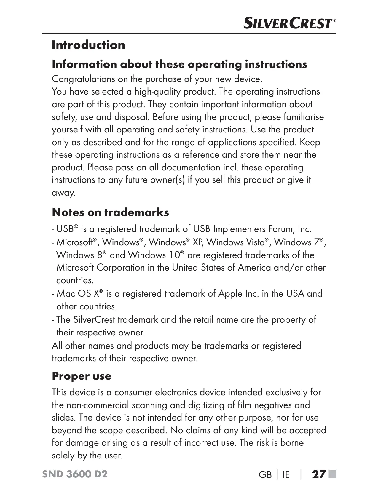 Proper use This device is a consumer electronics device intended exclusively for the non-commercial scanning and digitizing of film negatives and slides. The device is not intended for any other purpose, nor for use beyond the scope described. No claims of any kind will be accepted for damage arising as a result of incorrect use. The risk is borne solely by the user. SND 3600 D2