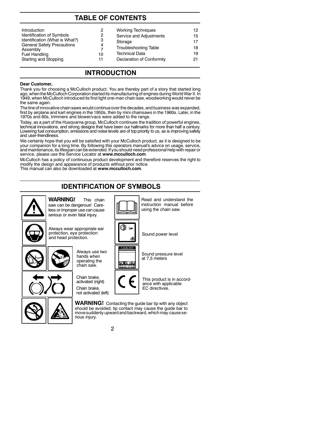 INTRODUCTION Dear Customer, Thank you for choosing a McCulloch product. You are thereby part of a story that started long ago, when the McCulloch Corporation started its manufacturing of engines during World War II. In 1949, when McCulloch introduced its first light one-man chain saw, woodworking would never be the same again. The line of innovative chain saws would continue over the decades, and business was expanded, first by airplane and kart engines in the 1950s, then by mini chainsaws in the 1960s. Later, in the 1970s and 80s, trimmers and blower/vacs were added to the range. Today, as a part of the Husqvarna group, McCulloch continues the tradition of powerful engines, technical innovations, and strong designs that have been our hallmarks for more than half a century. Lowering fuel consumption, emissions and noise levels are of top priority to us, as is improving safety and user-friendliness. We certainly hope that you will be satisfied with your McCulloch product, as it is designed to be your companion for a long time. By following this operators manual’s advice on usage, service, and maintenance, its lifespan can be extended. If you should need professional help with repair or service, please use the Service Locator at www.mcculloch.com. McCulloch has a policy of continuous product development and therefore reserves the right to modify the design and appearance of products without prior notice. This manual can also be downloaded at www.mcculloch.com.