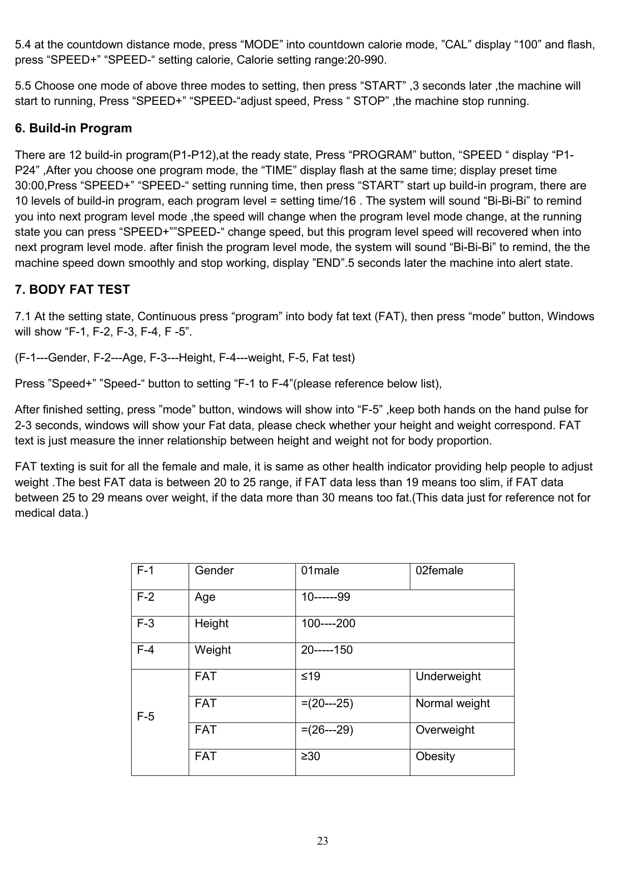 7.1 Pendant les réglages, accédez à BODY FAT TEST (FAT) en appuyant plusieurs fois sur PROGRAM. Puis appuyez sur la touche MODE. F-1, F-2, F-3, F-4 et F-5 s’affichent (F-1 - Sexe, F-2 - Âge, F-3 - Taille, F-4 - Poids, F-5 - IMC) 1.2 Accrochez la pince de sécurité sur vos vêtements et placez la clé de sécurité dans la console. Si la clé de sécurité n’est pas placée au bon endroit, l’appareil ne fonctionnera pas.