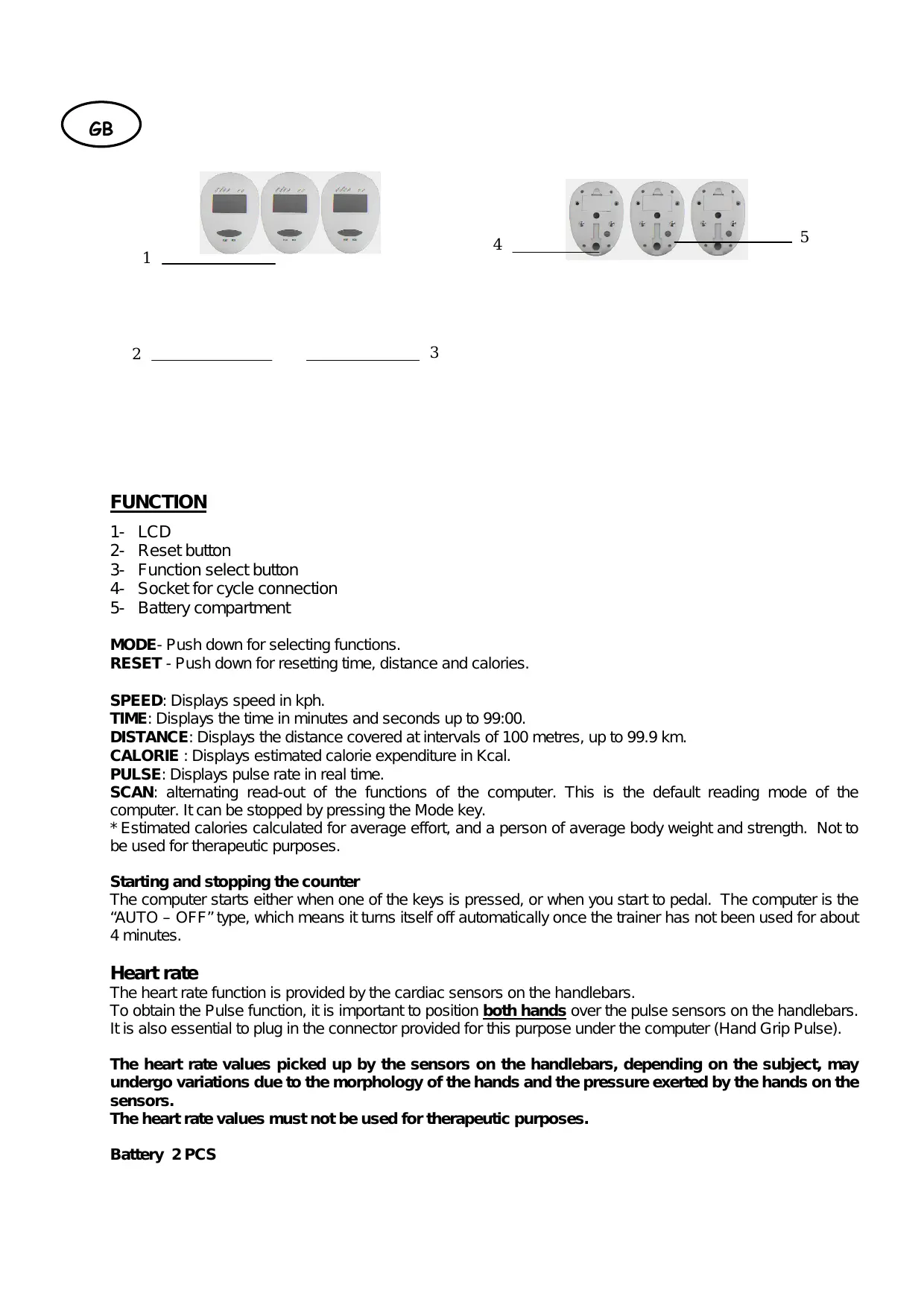 FUNCTION 12345- LCD Reset button Function select button Socket for cycle connection Battery compartment MODE- Push down for selecting functions. RESET - Push down for resetting time, distance and calories. SPEED: Displays speed in kph. TIME: Displays the time in minutes and seconds up to 99:00. DISTANCE: Displays the distance covered at intervals of 100 metres, up to 99.9 km. CALORIE : Displays estimated calorie expenditure in Kcal. PULSE: Displays pulse rate in real time. SCAN: alternating read-out of the functions of the computer. This is the default reading mode of the computer. It can be stopped by pressing the Mode key.