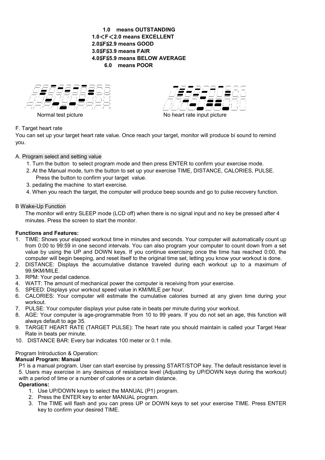 Pédalez et l’écran s’allumera immédiatement. Arrêtez de pédaler et il s’arrêtera après 4 secondes. Vous ne pouvez sélectionner le programme et définir l’exercice qu’à l’arrêt. B. Fonction HAUT (UP) et BAS (DOWN) 1. Lors du réglage du programme, tournez le bouton pour augmenter (sens horaire) ou diminuer (sens antihoraire) la valeur. 2. Pendant l’exercice, tournez le bouton pour augmenter ou diminuer le niveau de résistance. C. Fonction Entrée (Enter) Appuyez sur le bouton pour confirmer votre choix de programme ou la valeur cible pour votre exercice. Vous pouvez définir la durée, la distance et le nombre de calories brûlées, mais seule une valeur peut être votre cible à chaque fois. D. Fonction réinitialisation de l’écran (Reset monitor) Maintenir le bouton enfoncé 3 secondes permet de réinitialiser l’écran. E. Fonction de récupération de la fréquence cardiaque (Pulse Recovery) Une fois votre objectif atteint, l’écran émettra le son bip pendant 5 secondes. Veuillez alors placer vos mains sur le capteur de fréquence cardiaque. Vous obtiendrez le résultat après une minute. le compte à rebours commence : 01:00 - 00:59 - - jusqu’à 00:00. Une fois 00:00 atteint, l’ordinateur affichera votre statut de récupération de la fréquence cardiaque par une note comprise entre F1.0 et F6.0. 1.0 signifie EXCEPTIONNEL 1.0<F<2.0 signifie EXCELLENT 2.0≦F≦2.9 signifie BIEN 2. En mode Manuel, tournez le bouton pour régler la DURÉE (TIME), la DISTANCE, les CALORIES et la FRÉQUENCE CARDIAQUE (PULSE) pour votre exercice. Appuyez sur le bouton pour confirmer votre valeur cible. 3. Pédalez pour commencer l’exercice. 4. Une fois la cible atteinte, l’ordinateur émettra le son bip et passera à la fonction de récupération de la fréquence cardiaque. B. Comment rallumer le moniteur Le moniteur se mettra en VEILLE (écran éteint) s’il ne reçoit pas de signal ou si aucune touche n’est activée pendant 4 minutes. Touchez l’écran pour rallumer le moniteur. Fonctions et caractéristiques : 1. TEMPS : Montre votre temps d'entraînement écoulé en minutes et secondes. Votre ordinateur comptera automatiquement de 0:00 à 99:59 par intervalles d'une seconde. Vous pouvez également programmer votre ordinateur pour décompter à partir d'une valeur réglée en utilisant les touches UP et DOWN. Si vous continuez l’exercice une fois que le temps a atteint 0:00, l'ordinateur commencera à biper et se remettra au temps réglé, vous faisant savoir que votre séance d'entraînement est terminée. 2. DISTANCE : Montre la distance cumulée pendant chaque séance d'entraînement jusqu’au maximum de 99.9KM. 3. RPM : Votre cadence de pédalage. 4. WATT : La quantité d’énergie mécanique que l'ordinateur reçoit de votre exercice. 5. VITESSE : Montre votre vitesse d'entraînement en KM par heure. 6. CALORIES : Votre ordinateur estimera les calories cumulatives brûlées à un moment donné pendant votre séance d'entraînement. 7. POULS : Votre ordinateur indique votre pouls en battements par minute pendant votre séance d'entraînement. 8. ÂGE : Vous pouvez programmer votre âge de 10 à 99 ans. Si vous ne réglez pas l’âge, cette fonction sera toujours par défaut réglée à 35. 9. FRÉQUENCE CARDIAQUE CIBLEE (POULS CIBLE) : La fréquence cardiaque que vous devez maintenir s'appelle votre fréquence cardiaque ciblée en battements par minute. 10. BARRE DE DISTANCE : Chaque barre correspond à 100 mètres ou 0,1 mile. Introduction & mode d’emploie des programmes : Programme manuel : Manuel P1 est un programme manuel. L'utilisateur peut commencer l'exercice en appuyant sur la touche START/STOP. Le niveau de résistance par défaut est 5. Les utilisateurs peuvent s'exercer à tout niveau de résistance désiré (en ajustant par les touches UP et DOWN pendant la séance d'entraînement) avec un certain temps ou un certain nombre de calories ou une certaine distance. Mode d’emploi : 1. Employez les touches UP et DOWN pour choisir le programme MANUEL (P1). 2. Appuyez sur la touche ENTER pour entrer dans le programme MANUEL. 3. Le TEMPS clignotera et vous pouvez appuyer sur les touches UP et DOWN pour régler votre TEMPS d'exercice. Appuyez sur la touche ENTER pour confirmer votre TEMPS désiré. 4. La DISTANCE clignotera et vous pouvez appuyer sur les touches UP et DOWN pour régler votre DISTANCE ciblée. Appuyez sur la touche ENTER pour confirmer votre DISTANCE désirée.