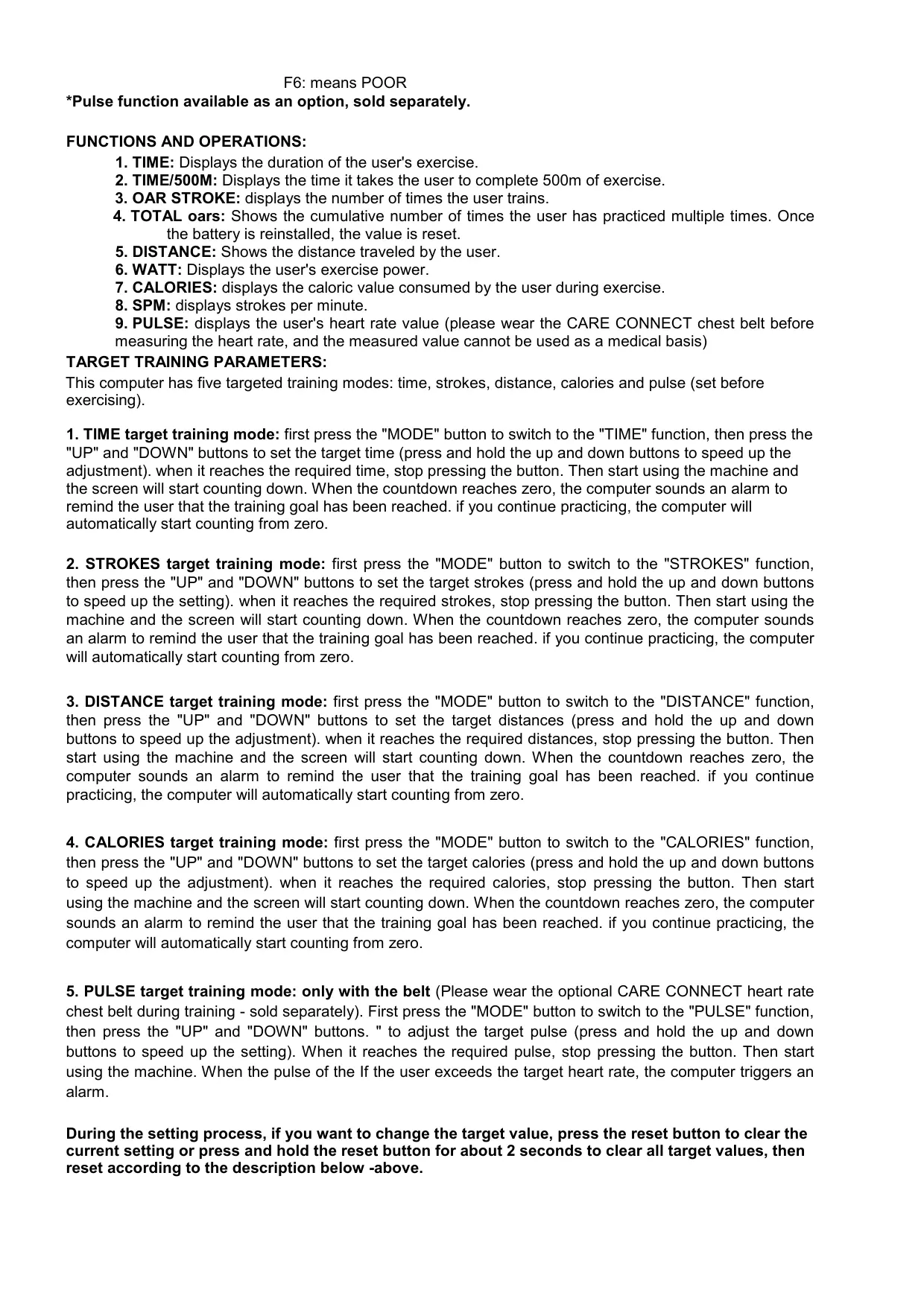 SPM, les fonctions distance et watt, les fonctions coups de rames et coups de rames total. HAUT/BAS – Pour définir les valeurs de temps, NB de coup de rames, la distance, des calories et de pulsation. RESET – Appuyez sur le bouton mode pour passer à la fonction cible, puis appuyez sur le bouton reset pour réinitialiser la valeur de la fonction (temps, NB de coup de rames, distance, calories et pulsation). Appuyez et maintenez enfoncé le bouton de réinitialisation pendant environ 2 secondes pour redémarrer l'ordinateur, et toutes les valeurs de l'ordinateur seront réinitialisées (sauf le nombre total de coup de rames qui reviendra à zéro une fois la batterie réinstallée). RÉCUPÉRATION – Appuyez sur ce bouton pour tester la capacité de récupération du pouls de l'utilisateur. Après une période d'exercice, vous devez toujours porter la ceinture thoracique sans fil. Lorsque l'ordinateur affiche la valeur du pouls, appuyez sur ce bouton pour démarrer la fonction de récupération du pouls. L'ordinateur entrera dans le compte à rebours de 60 secondes. Après le compte à rebours, l'état de récupération du pouls de l'utilisateur sera affiché à l'écran. L'état de récupération représenté par la valeur F est le suivant : (Appuyez sur le bouton de réinitialisation pour revenir à l'écran d'affichage principal.) F1 :signifie EXCEPTIONNEL F2 : signifie EXCELLENT F3 : signifie BON F4 : signifie JUSTE F5 : signifie EN DESSOUS DE LA MOYENNE F6 : signifie PAUVRE *Fonction pulse disponible en option, vendue séparément. FONCTIONS ET OPÉRATIONS : 1. TIME : affiche la durée de l'exercice de l'utilisateur. 2. TIME/500M : affiche le temps nécessaire à l'utilisateur pour effectuer 500 m d'exercice. 3. COUPS de rames : affiche le nombre de fois que l'utilisateur s'entraîne. 4. TOTAL de rames: Affiche le nombre cumulé de fois que l'utilisateur s'est exercé plusieurs fois. Une fois la batterie réinstallée, la valeur est réinitialisée. 5. DISTANCE : affiche la distance parcourue par l'utilisateur. 6. WATT : affiche la puissance d'exercice de l'utilisateur.