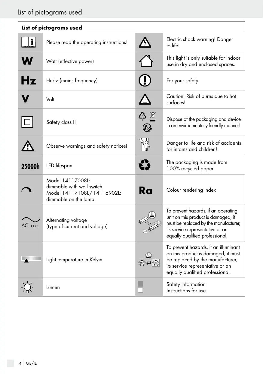 GB/IE During the warranty period any defects in material or manufacture will be replaced free of charge. In the event of a defect during the warranty period, please send the appliance to the service address listed, indicating the following model number: 14117008L / 14117108L / 14116902L. Expendable parts (such as bulbs) and damage caused by improper handling, failure to observe the instructions for use or modification by unauthorised persons are excluded from the warranty. The performance of services under the warranty does not extend or renew the warranty period.