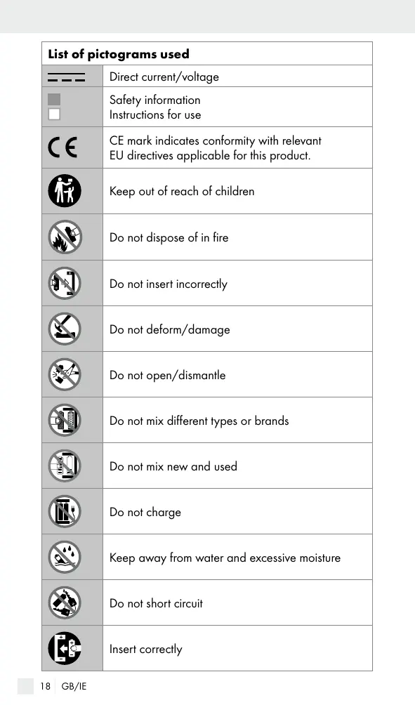 La marque CE indique la conformité aux directives européennes applicables à ce produit. À conserver hors de la portée des enfants Ne pas jeter au feu Veiller à une insertion correcte Ne pas déformer/détériorer Ne pas ouvrir/démonter Ne pas mélanger des types et des marques différents Ne pas mélanger des piles usées et des piles neuves Ne pas recharger Tenez les piles éloignées de l’eau et d’une humidité excessive. Ne pas court-circuiter Insérer correctement 28