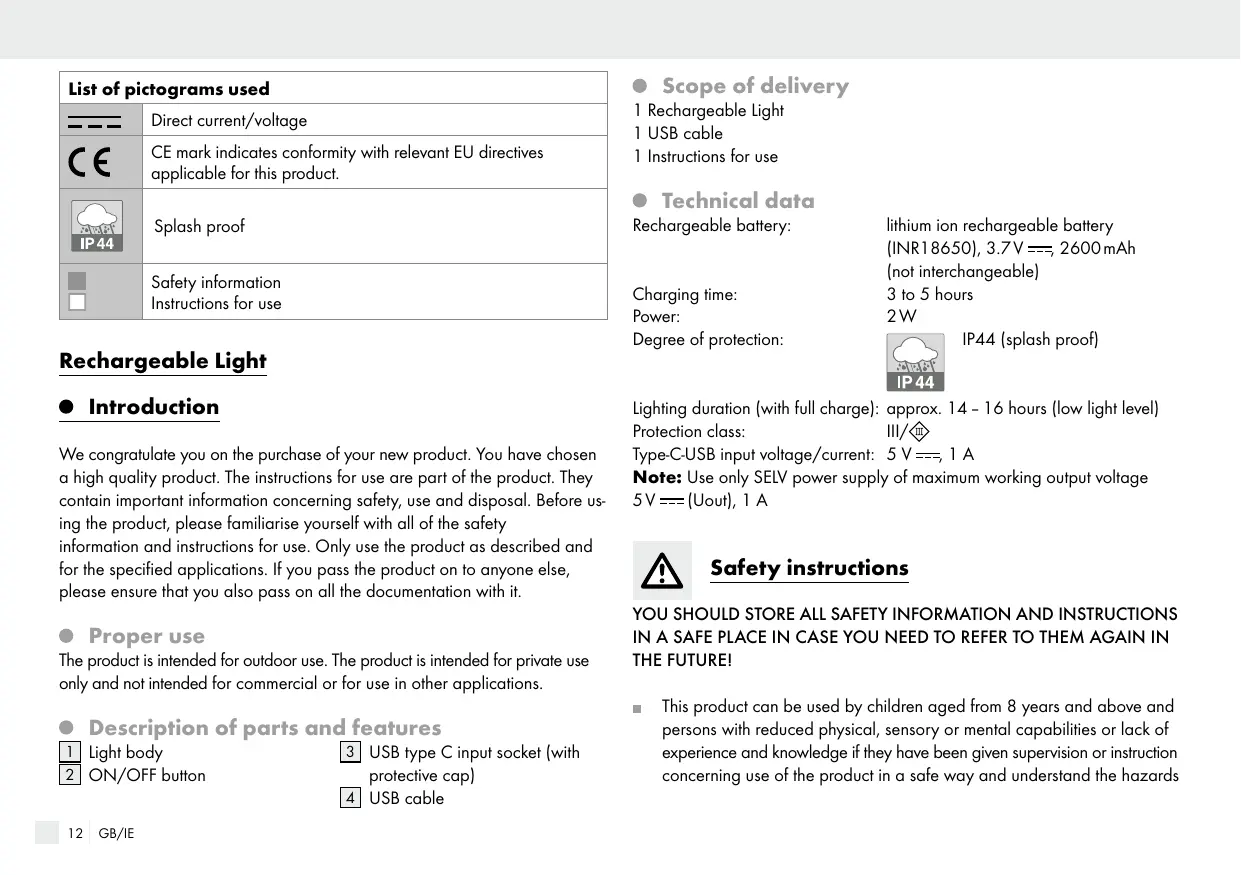 GB/IE Lighting duration (with full charge): approx. 14 – 16 hours (low light level) Protection class: III/ Type-C-USB input voltage/current: 5 V , 1 A Note: Use only SELV power supply of maximum working output voltage 5V