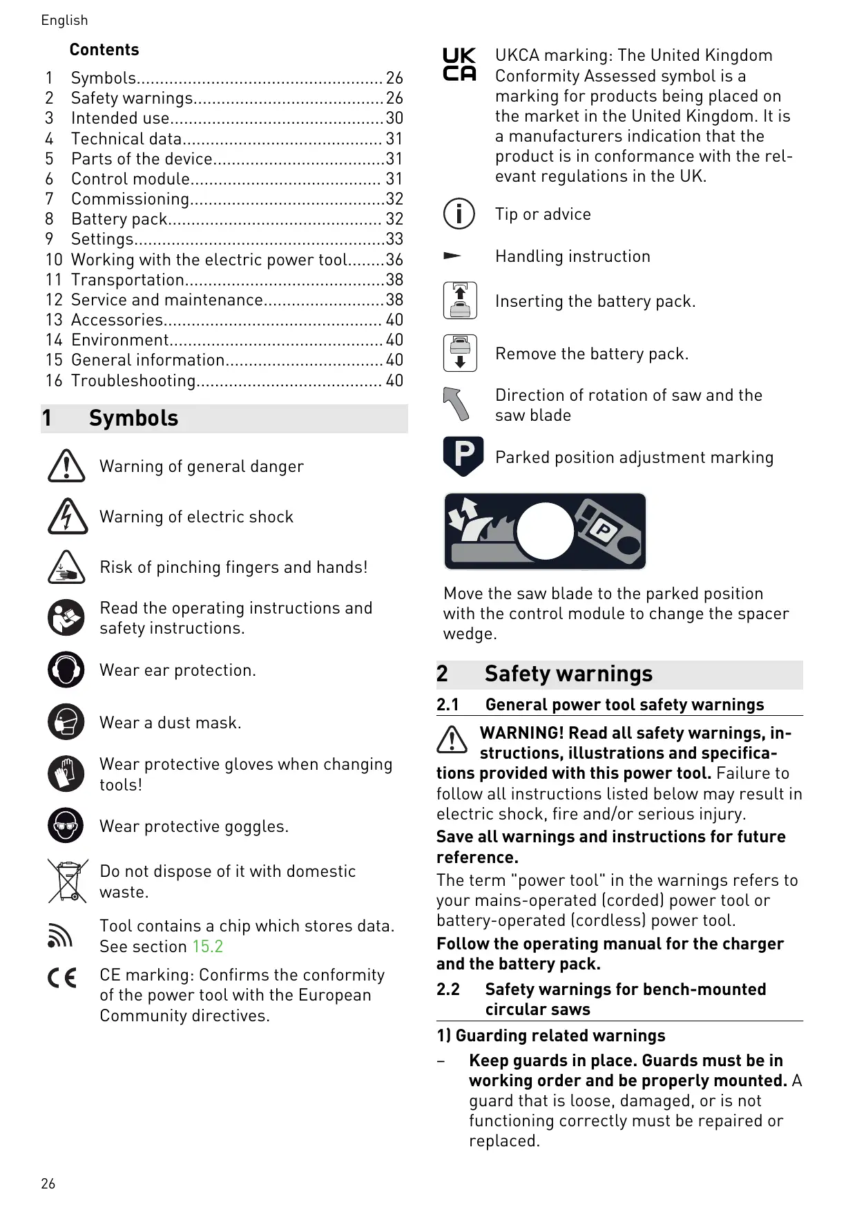 EN 303 446-1 V1.2.1 EN 301 489-1 V2.2.3, EN 301 489-17 V3.2.4 BS EN IEC 63000:2018 UK Approved Body for UK Type-examination: Technology International (Europe) Ltd. Unit 56, Shrivenham Hundred Business Park Lire le mode d'emploi et les consignes de sécurité ! Porter une protection auditive ! Porter une protection respiratoire ! Porter des gants de protection pour procéder au changement d'outil ! Porter des lunettes de protection ! Ne pas jeter avec les ordures ménagè res. L'outil contient une puce permettant l'enregistrement des données. Voir chapitre 15.2 Marquage CE : confirme la conformité de l'outil électroportatif aux directives de la Communauté européenne. Conseil, information Instruction