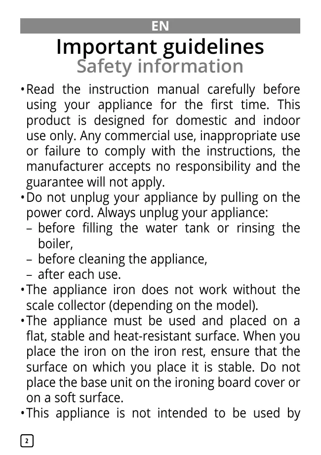 8 ans et plus et les personnes manquant d'expérience et de connaissances ou dont les capacités physiques, sensorielles ou mentales sont réduites, si elles ont été formées et encadrées quant à l'utilisation de l'appareil d'une manière sûre et connaissent les risques encourus. Les enfants ne doivent pas jouer avec l'appareil. Les enfants ne doivent ni nettoyer l'appareil ni s'occuper de son entretien sans surveillance. Gardez le fer et le cordon hors de la portée des enfants de moins de 8 ans lorsque le fer est sous tension ou en cours de refroidissement.