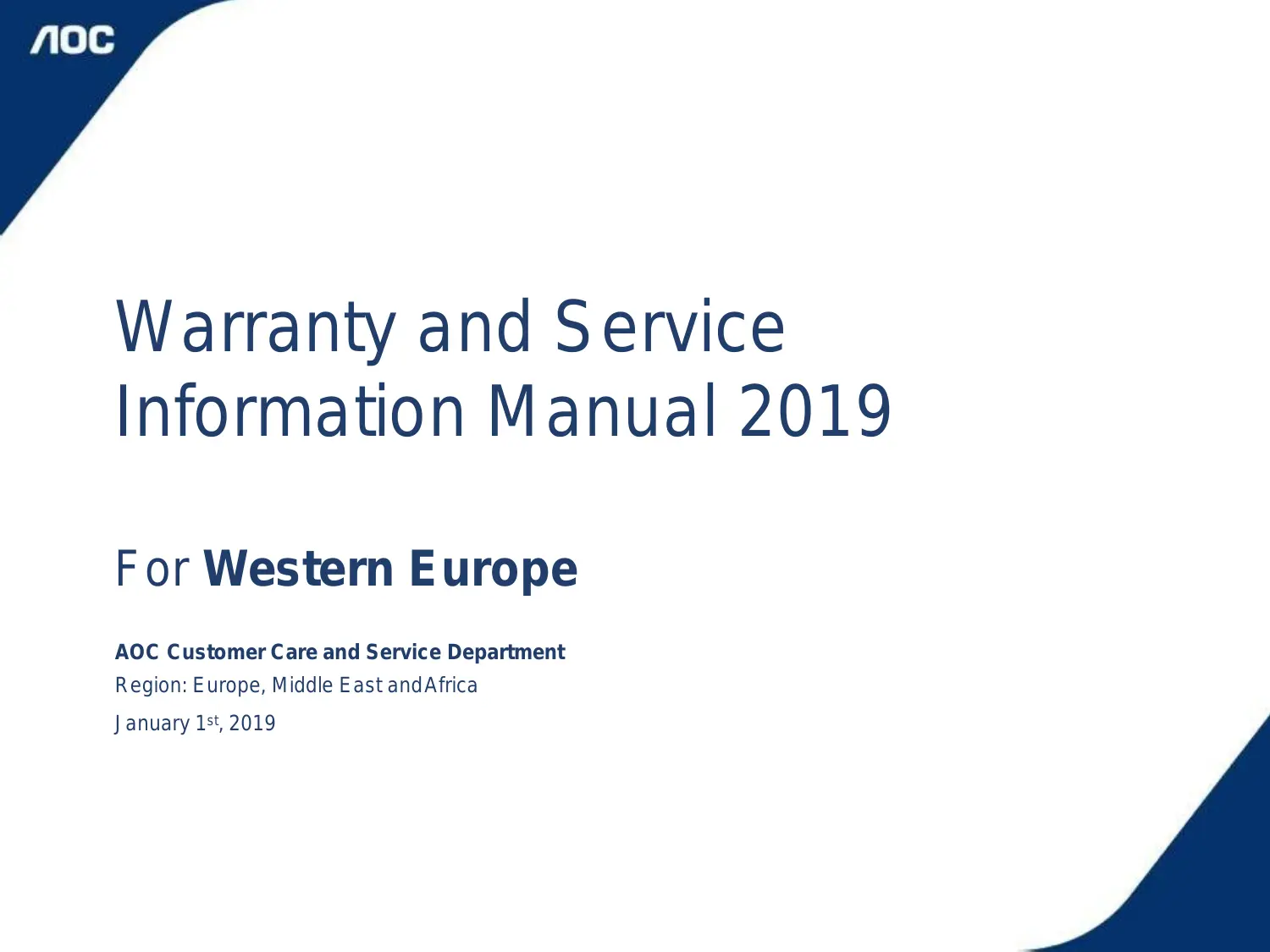 To obtain service within the warranty period please contact the AOC Customer Service Centre. Contact details of the AOC Customer Service Centre can be found on www.aoc-europe.com or the hotline list, which can be found in this document.