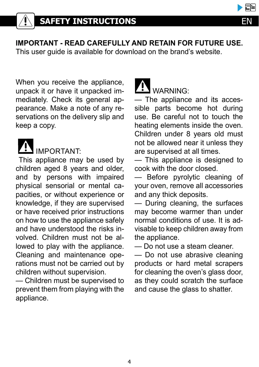 IMPORTANT - READ CAREFULLY AND RETAIN FOR FUTURE USE. This user guide is available for download on the brand's website. When you receive the appliance, unpack it or have it unpacked im- mediately. Check its general ap- pearance. Make a note of any re- servations on the delivery slip and keep a copy. EN IMPORTANT: This appliance may be used by children aged 8 years and older, and by persons with impaired physical sensorial or mental ca- pacities, or without experience or knowledge, if they are supervised or have received prior instructions on how to use the appliance safely and have understood the risks in- volved. Children must not be al- lowed to play with the appliance. Cleaning and maintenance ope- rations must not be carried out by children without supervision. — Children must be supervised to prevent them from playing with the appliance. EN rune: — The appliance and its acces- sible parts become hot during use. Be careful not to touch the heating elements inside the oven. Children under 8 years old must not be allowed near it unless they are supervised at all times. — This appliance is designed to cook with the door closed. — Before pyrolytic cleaning of your oven, remove all accessories and any thick deposits. — During cleaning, the surfaces may become warmer than under normal conditions of use. lt is ad- visable to keep children away from the appliance. — Do not use a steam cleaner. — Do not use abrasive cleaning products or hard metal scrapers for cleaning the oven's glass door, as they could scratch the surface and cause the glass to shatter.