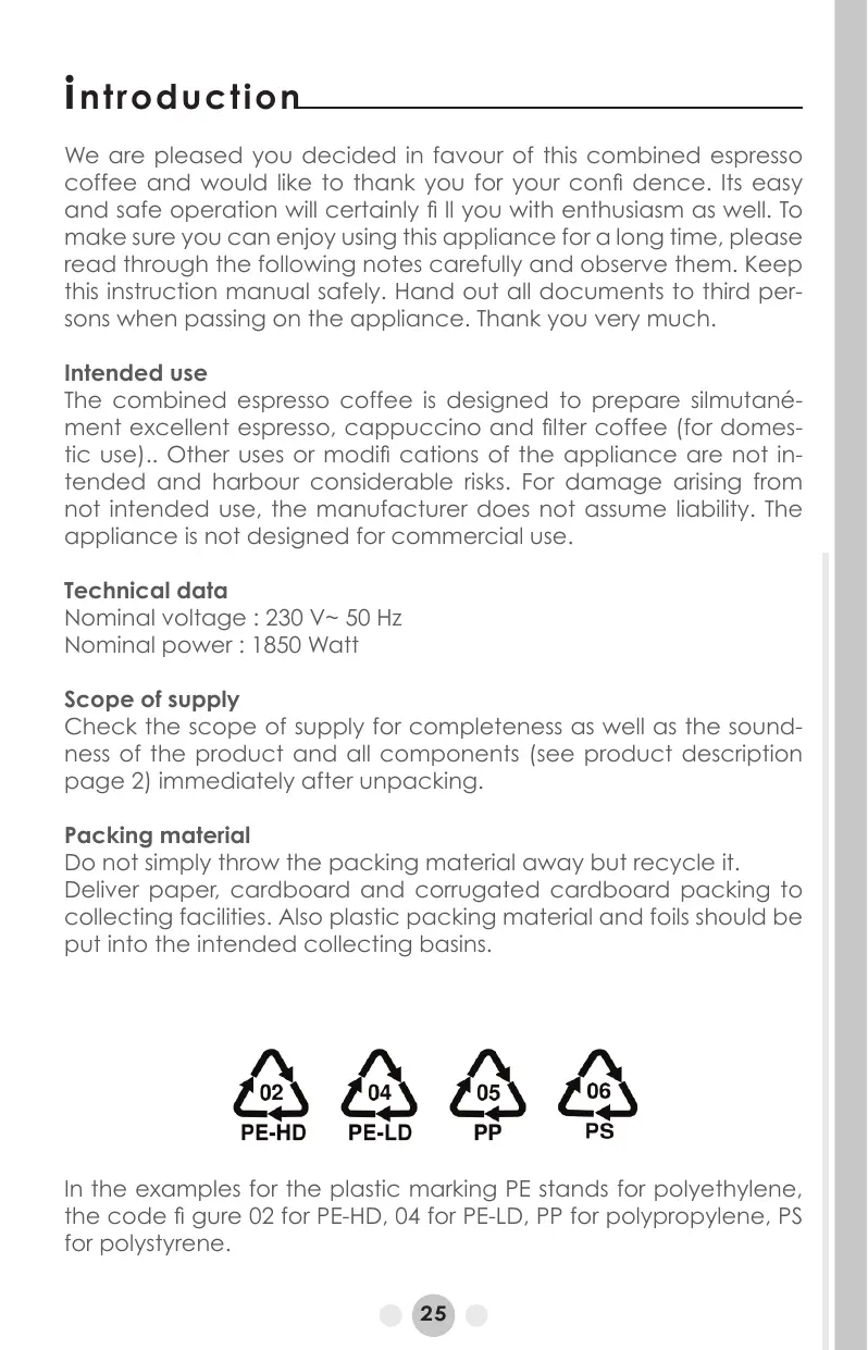 We are pleased you decided in favour of this combined espresso coffee and would like to thank you for your confidence. Its easy and safe operation will certainly fit you with enthusiasm as well. To make sure you can enjoy using this appliance for a long time, please read through the following notes carefully and observe them. Keep this instruction manual safely. Hand out all documents to third persons when passing on the appliance. Thank you very much.