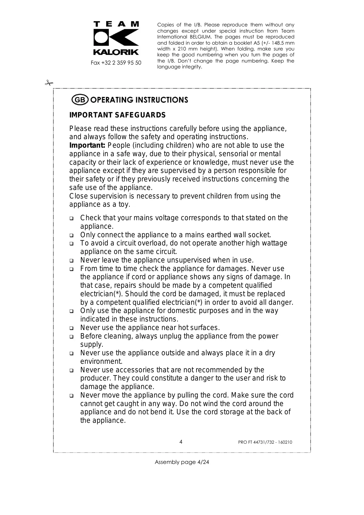 changes except under special instruction from Team Intemational BELGIUM. The pages must be reproduced and folded in order to obtain a bookiet A5 (+/- 148.5 mm width x 210 mm height]. When folding, make sure you KALORIK _ {ccp ine good numberng when you lum lhe pages of Fax +32 2 359 95 50 ihe 1/8. Don't change the page numbering. Keep the