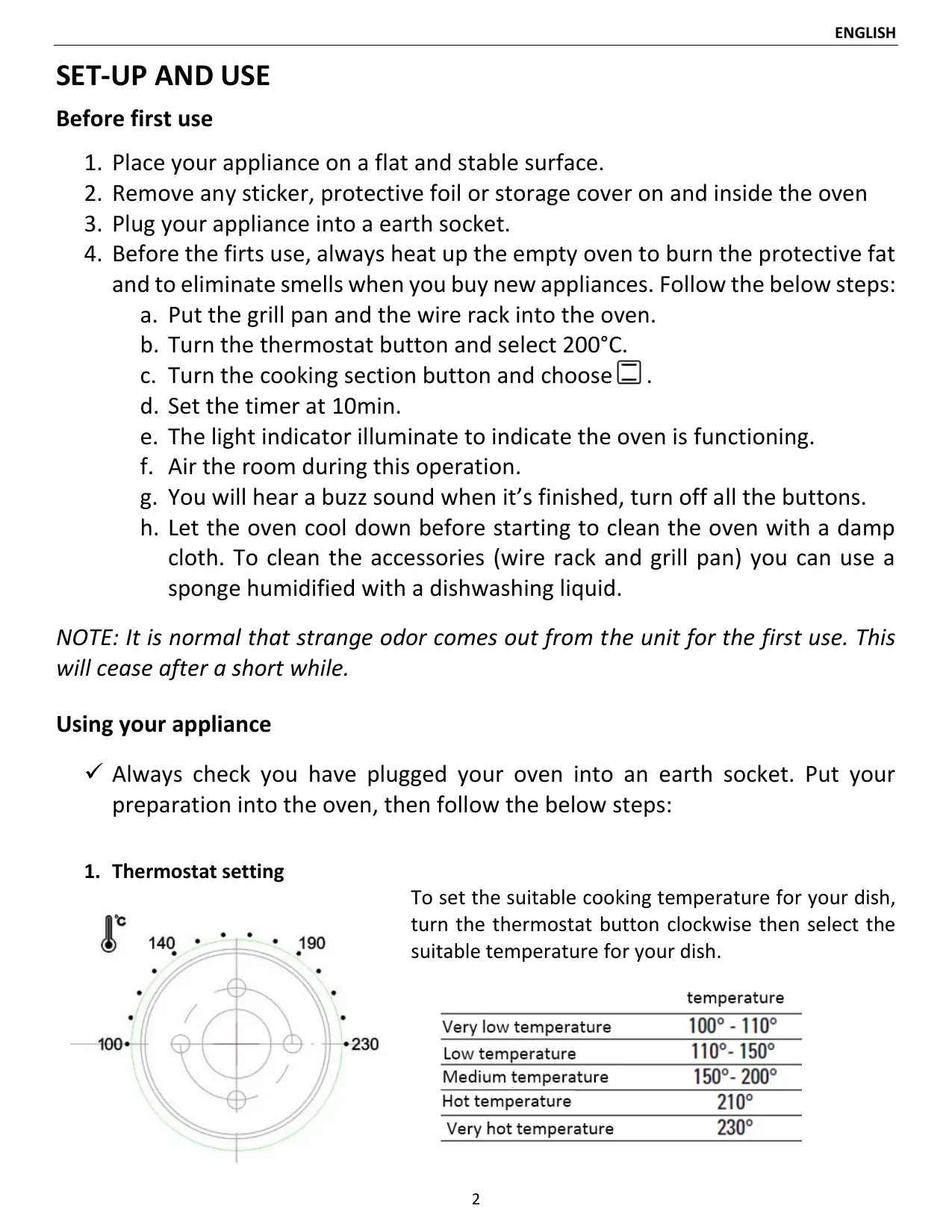 Before the firts use, always heat up the empty oven to burn the protective fat and to eliminate smells when you buy new appliances. Follow the below steps: