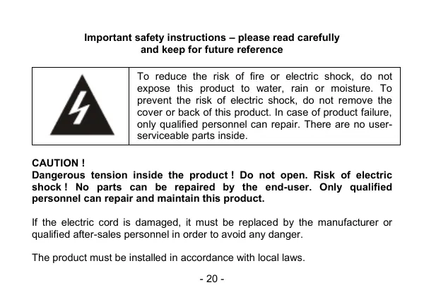 CAUTION ! Dangerous tension inside the product ! Do not open. Risk of electric shock! No parts can be repaired by the end-user. Only qualified personnel can repair and maintain this product.