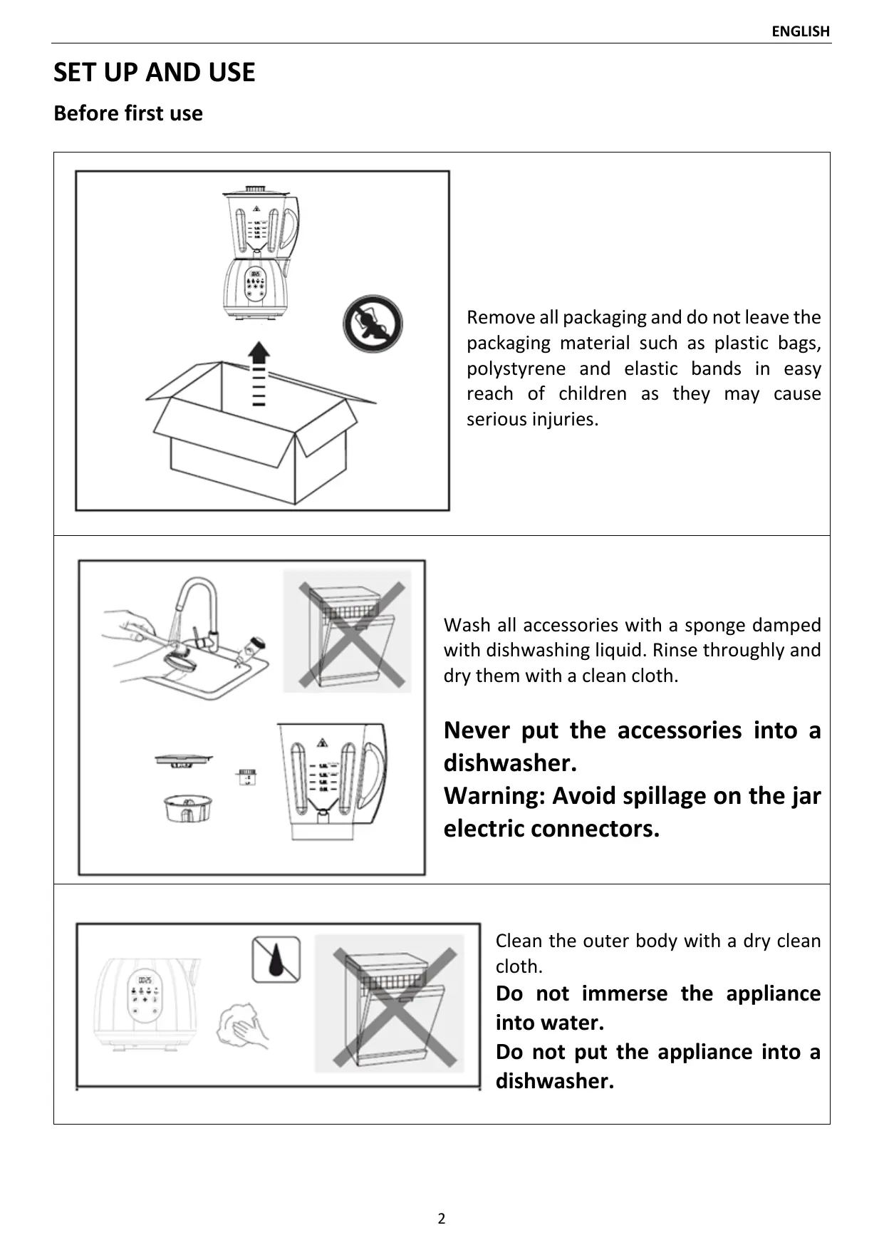 - Ensure to always unplug your appliance before any cleaning operation. Never put the motor unit into the dishwashing or under the water.