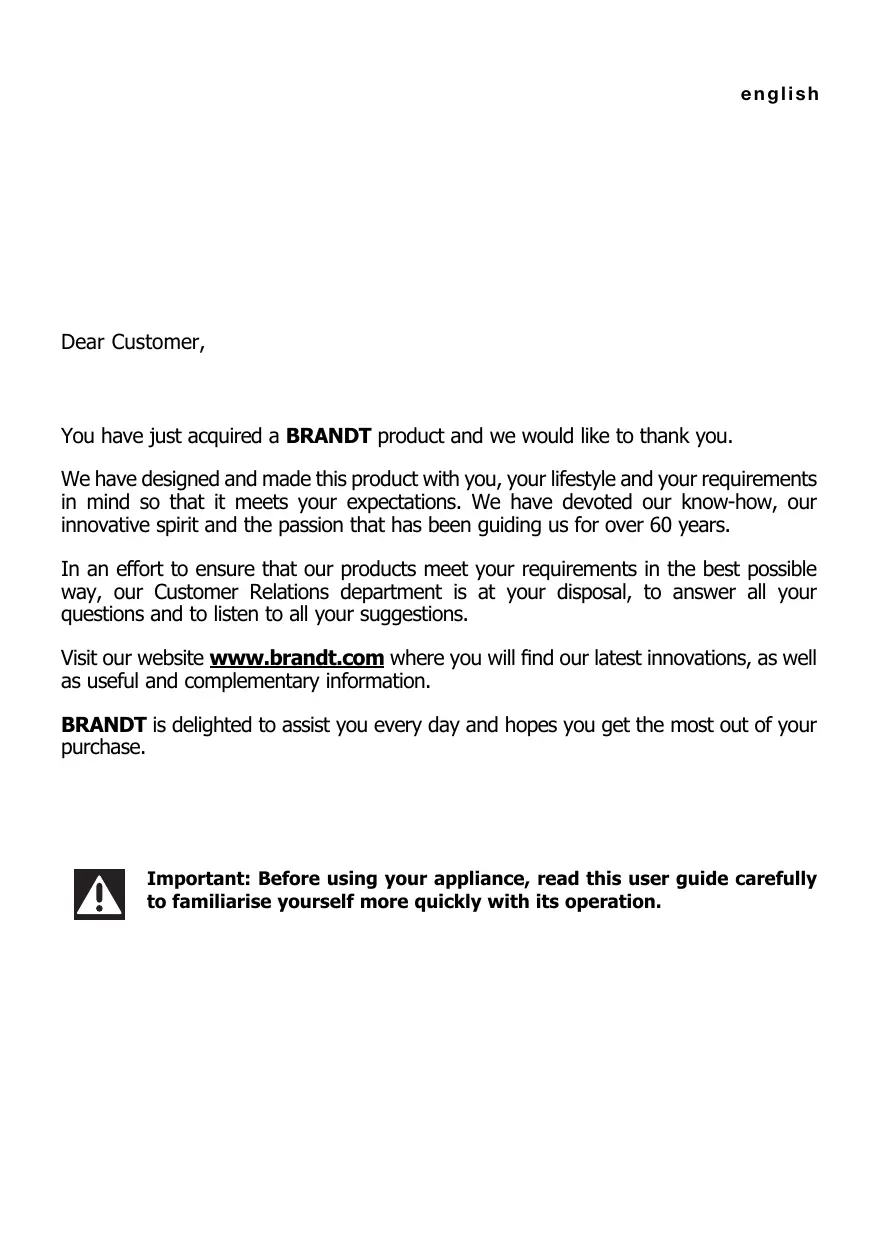 english Dear Customer, You have just acquired a BRANDT product and we would like to thank you. We have designed and made this product with you, your lifestyle and your requirements in mind so that it meets your expectations. We have devoted our know-how, our innovative spirit and the passion that has been guiding us for over 60 years. In an effort to ensure that our products meet your requirements in the best possible way, our Customer Relations department is at your disposal, to answer all your questions and to listen to all your suggestions. Visit our website www.brandt.com where you will find our latest innovations, as well as useful and complementary information. BRANDT is delighted to assist you every day and hopes you get the most out of your purchase. Important: Before using your appliance, read this user guide carefully to familiarise yourself more quickly with its operation.
