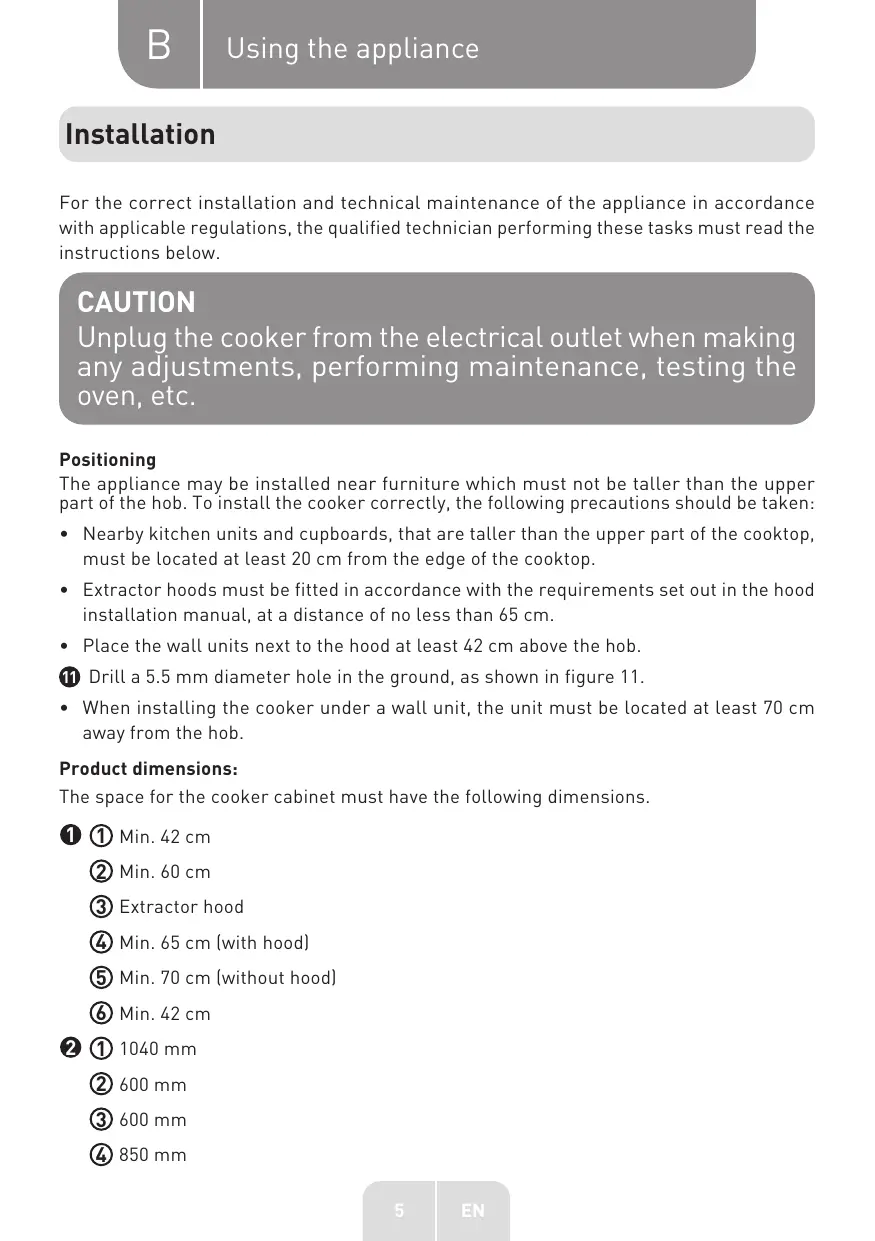 Using the appliance Installation For the correct installation and technical maintenance of the appliance in accordance with applicable regulations, the qualified technician performing these tasks must read the instructions below. CAUTION Unplug the cooker from the electrical outlet when making any adjustments, performing maintenance, testing the oven, etc. Positioning The appliance may be installed near furniture which must not be taller than the upper part of the hob. To install the cooker correctly, the following precautions should be taken: + Nearby kitchen units and cupboards, that are taller than the upper part of the cooktop, must be located at least 20 cm from the edge of the cooktop. + Extractor hoods must be fitted in accordance with the requirements set out in the hood installation manual, at a distance of no Less than 65 cm. +_ Place the wall units next to the hood at Least 42 cm above the hob. @® Drill a 5.5 mm diameter hole in the ground, as shown in figure 11. + When installing the cooker under a wall unit, the unit must be located at least 70 cm away from the hob. Product dimensions: The space for the cooker cabinet must have the following dimensions. © © Min. 42 cm © Min. 60 cm © Extractor hood @ Min. 65 cm [with hood) © Min. 70 cm [without hood) © Min. 42 em @ (D 1040 mm © 600 mm @) 600 mm © 850 mm