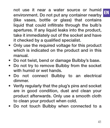 Ne jamais tenter de retirer ou de brancher Bulbby avec les mains humides ou mouillées.