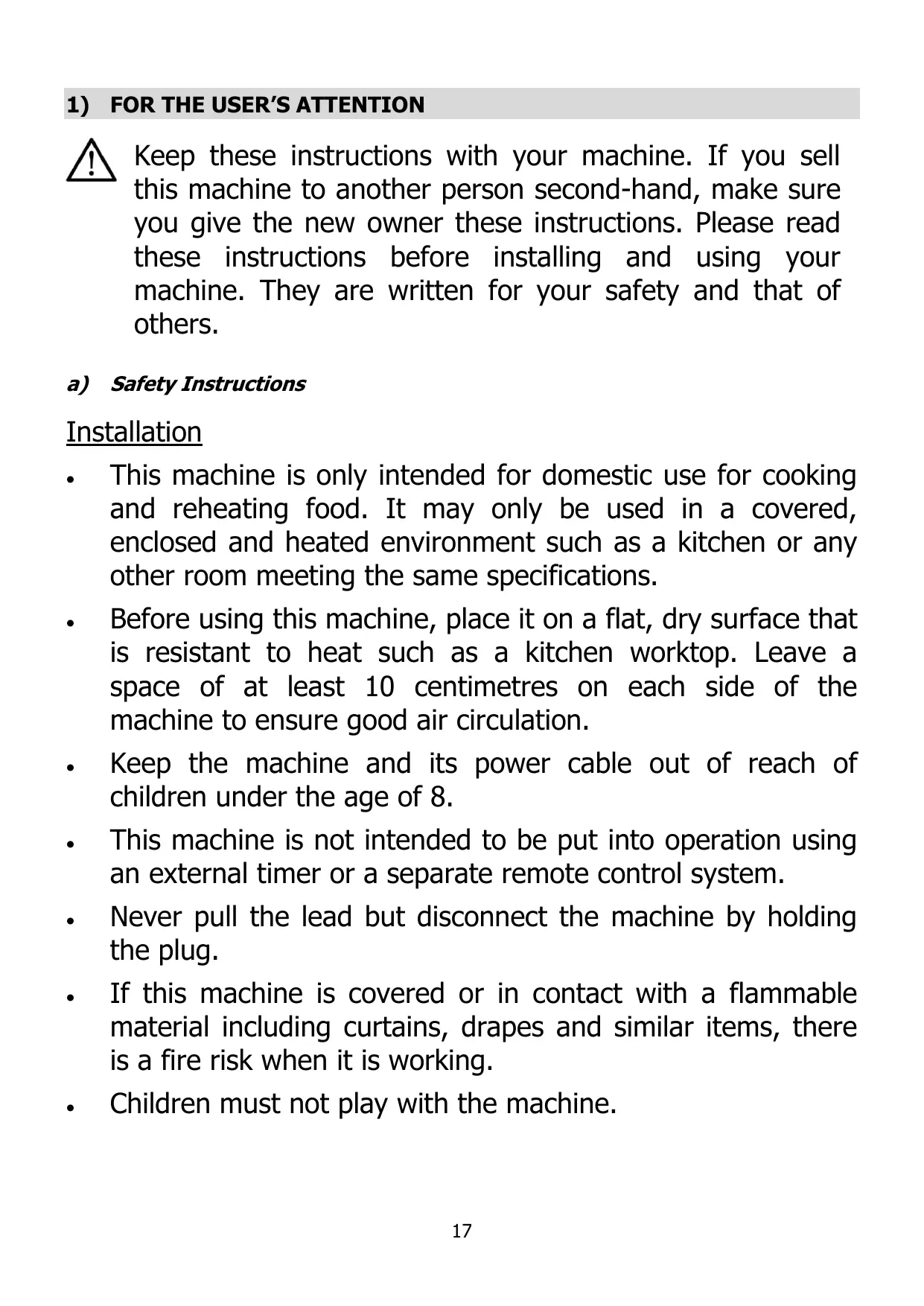 Cet appareil n'est pas destiné à un autre usage que celui de cuire ou réchauffer des aliments. Le séchage d'aliments, de serviettes, le réchauffage de serviettes humides où toute autre utilisation similaire peut entrainer un risque d'incendie ou des blessures.