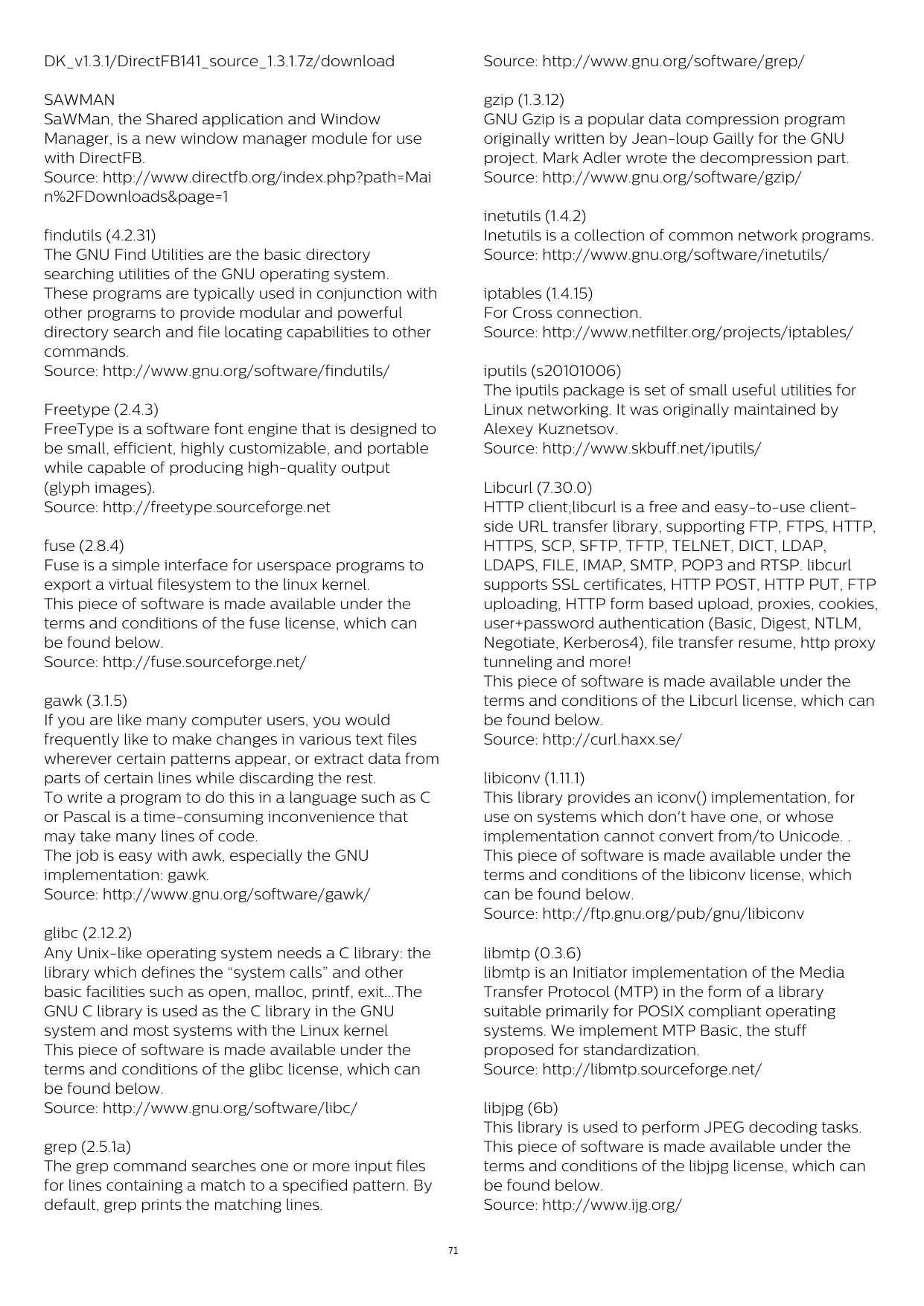 openssl (1.0.1j) OpenSSL is an open source implementation of the SSL and TLS protocols. The core library (written in the € programming language) implements the basic cryptographic functions and provides various utility functions. Wrappers allowing the use of the OpenSSL library in a variety of computer languages are available. Source: http://www.openssl.org/ procps (ps, top) (3.2.8) procps is the package that has a bunch of small useful utilities that give information about processes using the /proc filesystem The package includes the programs ps, top, vmstat, w, kill, free, slabtop, and skill Source: http://procps.sourceforge.net/index.html samba (3.0.37) Samba is the standard Windows interoperability suite of programs for Linux and Unix. Source: http://www.samba.org/ SaWMan (1.53) SaWMan, the Shared application and Window Manager, is a new window manager module for use with DirectFB. Source: http://www.directfb.org sed (4.1.5) sed (stream editor) isn't an interactive text editor. Instead, it is used to filter text, ï.e., it takes text input, performs some operation (or set of operations) on it, and outputs the modified text. sed is typically used for extracting part of a file using pattern matching or substituting multiple occurrences of a string within a file Source: http://www.gnu.org/software/sed/ SQLite3 (2.122) SQLite is a in-process library that implements a self- contained, serverless, zero-configuration, transactional SQL database engine This piece of software is made available under the terms and conditions of the SQLite3 license, which can be found below. Source: http://www.sqlite.org/ SquashFs SquashFsS is a compressed read-only file system for Linux. SquashFS compresses files, inodes and directories, and supports block sizes up to 1 MB for greater compression. SquashFsS is also the name of free/open software, licensed under the GPL, for accessing SquashFS filesysterms. This piece of software is made available under the terms and conditions of the SquashFsS license, which can be found below. Source: http://squashfs.sourceforge.net/ LE) tar (1.17) GNU Tar provides the ability to create tar archives, as well as various other kinds of manipulation For example, you can use Tar on previously created archives to extract files, to store additional files, or to update or list files which were already stored Source: http://www.gnu.org/software/tar/ u-Boot (2011.12) The uboot will load the linux kerenl to dram.and jump to run This piece of software is made available under the terms and conditions of the u-Boot loader license, which can be found below Source: http://www.denx.de udhcpc (0.9.8cvs20050303-3) Source: http://udhcp.sourcearchive.com/downloads/