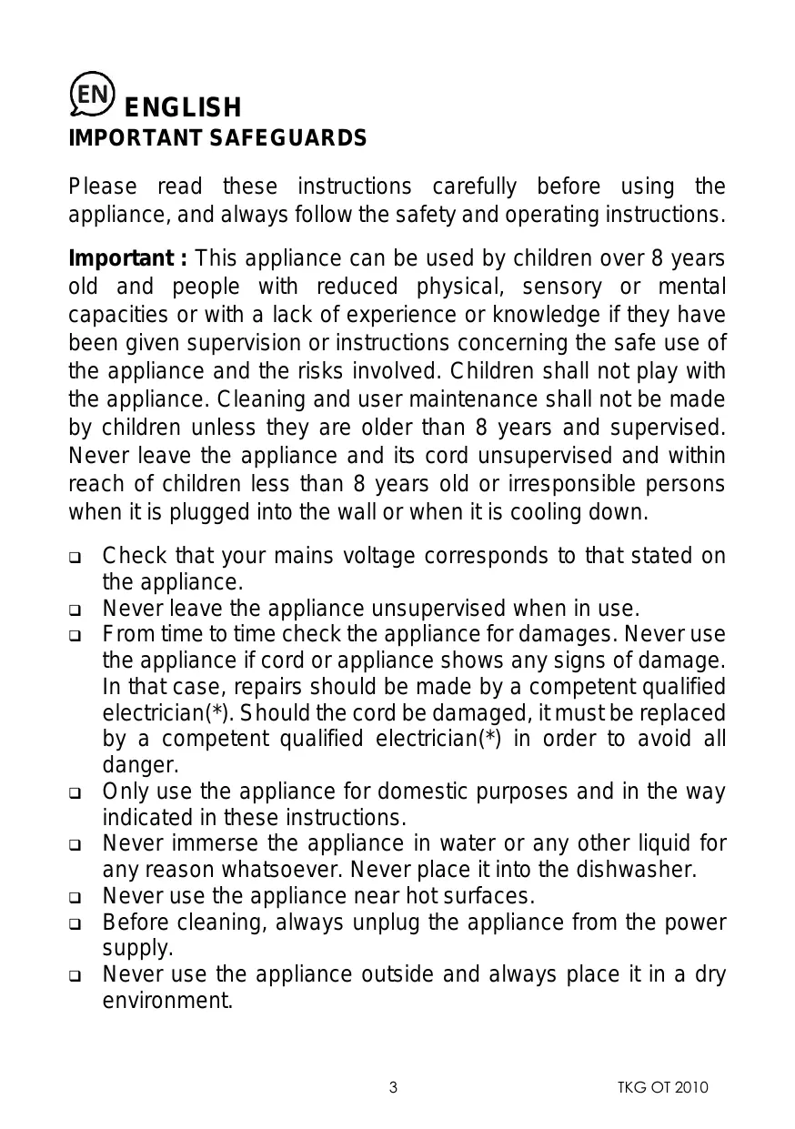 ŒN) ENGLISH IMPORTANT SAFEGUARDS Please read these instructions carefully before using the appliance, and always follow the safety and operating instructions.