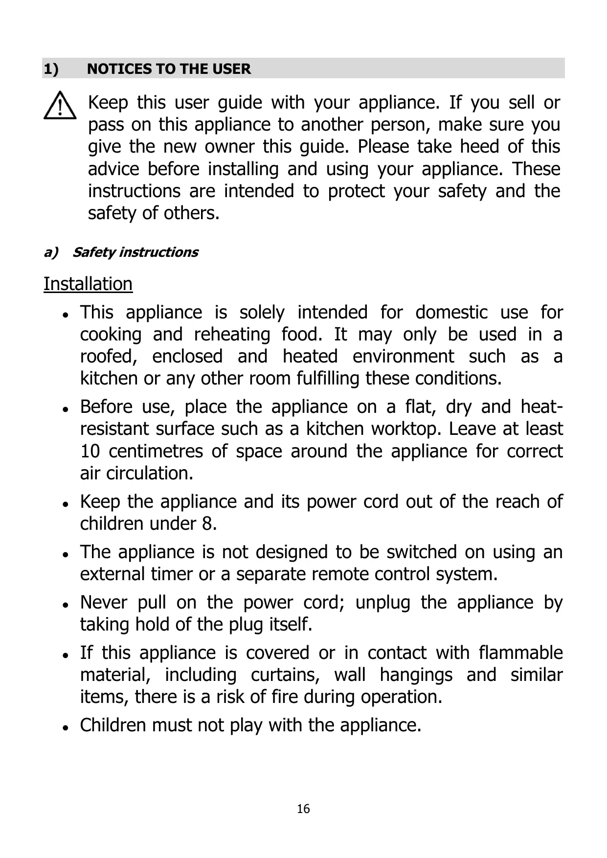 NOTICES TO THE USER Keep this user guide with your appliance. If you sell or pass on this appliance to another person, make sure you give the new owner this guide. Please take heed of this advice before installing and using your appliance. These instructions are intended to protect your safety and the safety of others.
