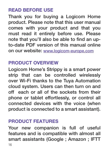 PRODUCT OVERVIEW Logicom Home’s Strippy is a smart power strip that can be controlled wirelessiy over Wi-Fi thanks to the Tuya Automation cloud system. Users can then turn on and off each or all of the sockets from their phone or tablet effortlessiy, or control all connected devices with the voice (when product is connected to a smart assistant).