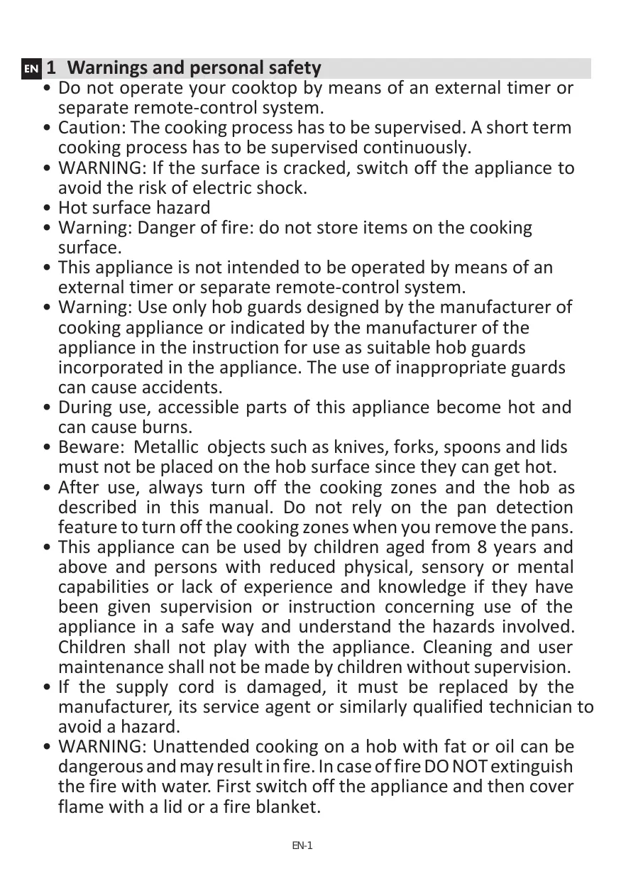 Advertencia: peligro de incendio: no almacene articulos en la superficie de coccién. Este aparato no estä diseñado para funcionar mediante un temporizador externo o un sistema de control remoto independiente. Advertencia: Utilice ünicamente protectores de placa diseñados por el fabricante del aparato de cocina o indicados por el fabricante del aparato en las instrucciones de uso como protectores de placa incorporados en el aparato. El uso de guardias inapropiados puede causar accidentes. Durante el uso, las partes accesibles de este aparato se calientan y pueden causar quemaduras. Cuidado: Los objetos metélicos como cuchillos, tenedores, cucharas y tapas no se deben colocar sobre la superficie de la placa de cocciôn ya que podrian calentarse. Después del uso, apague siempre las zonas de cocciôn y la placa como se describe en este manual. No confie en la funcién de deteccién de sartén/olla para apagar las zonas de cocciôn cuando retire las sartenes.