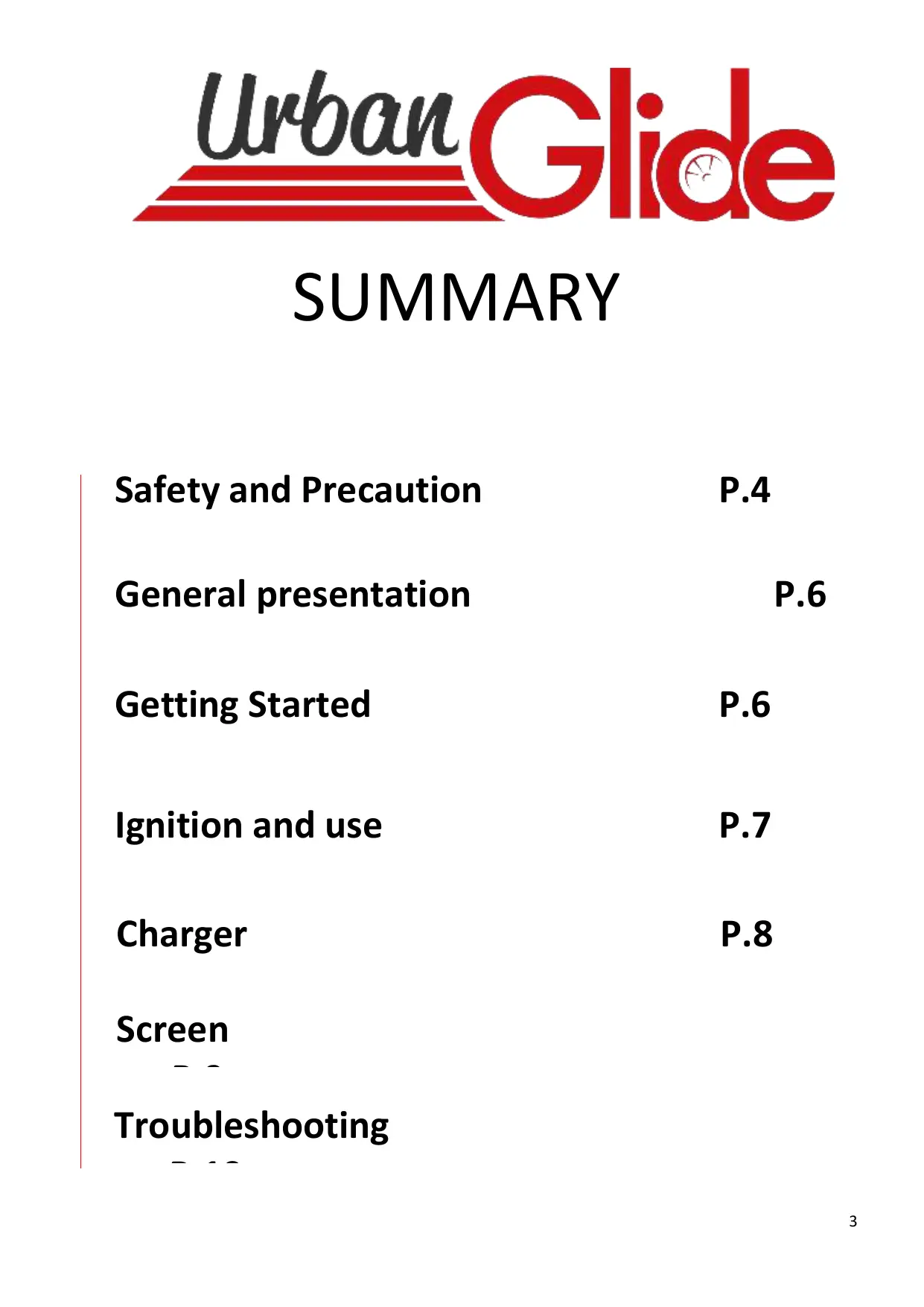 SUMMARY Safety and Precaution P.4 General presentation P.6 Getting Started P.6 Ignition and use P.7 Charger P.8
