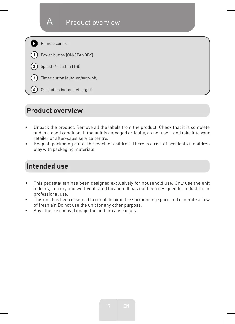 This pedestal fan has been designed exclusively for household use. Only use the unit indoors, in a dry and well-ventilated location. It has not been designed for industrial or professional use.