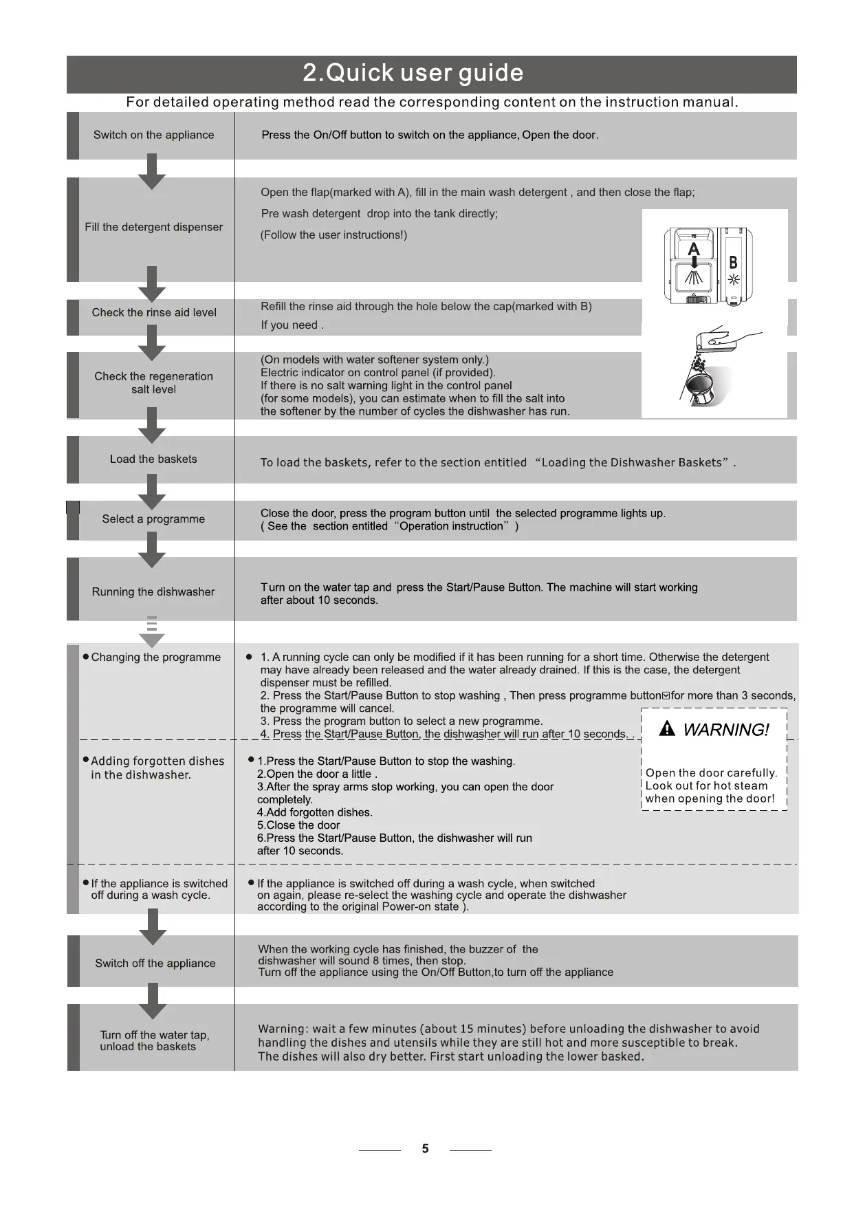 For det. Switch on the appliance Fill the detergent dispenser Check + rinse aid level Check the regeneration salt level Load the baskets Select ÿ ra Running the dishwasher Ve the programme +Adding forgotten dishes in the dishwasher. « Ifthe appliance is switched off ani a wash cycle. Turn off the water tap, unload the baskets | Switch off the appliance 2.Quick user guide ed operating method read the corresponding content on the instruction manual. Press the On/Off button to switch on the appliance, Open the door. Open the flap(marked with A), fil in the main wash detergent , and then close the flap; Pre wash detergent drop into the tank directly; {Follow the user instructions!) Refill the rinse aid through the hole below the cap(marked with B) If you need . (On models with water softener system only.) Electric indicator on control panel (if provided). Ifthere is no salt warning light in the control panel for some models), you can estimate when to fill the salt into the softener by the number of cycles the dishwasher has run. To load the baskets, refer to the section entitled “Loading the Dishwasher Baskets” Close the door, press the program button until the selected programme lights up. (See the section entitled “Operation instruction” Turn on the water tap and press the Start/Pause Button. The machine will start working after about 10 seconds. e 1. Arunning cycle can only be modified if it has been running for a short time. Otherwise the detergent may have already been released and the water already drained. If this is the case, the detergent dispenser must be refilled.