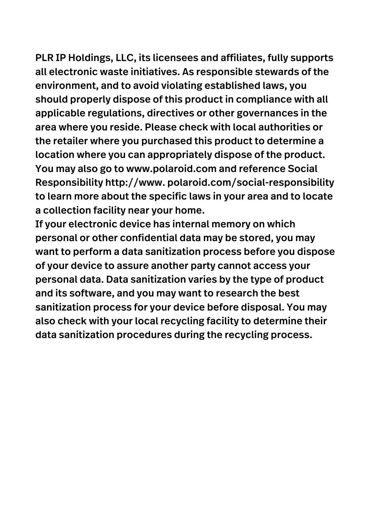 PLR IP Holdings, LLC, its licensees and affiliates, fully supports all electronic wasteinitiatives. As responsible stewards of the environment, and to avoid violating established laws, you should properly dispose of this product in compliance with all applicable regulations, directives or other governancesin the area where you reside. Please check with local authorities or the retailer where you purchased this product to determine a location where you can appropriately dispose of the product. You may also go to www.polaroid.com and reference Social Responsibility http://www. polaroid.com/social-responsibility to Learn more about the specific laws in your area and to locate a collection facility near your home. If your electronic device has internal memory on which personal or other confidential data may be stored, you may want to perform a data sanitization process before you dispose of your device to assure another party cannot access your personal data. Data sanitization varies by the type of product andits software, and you may want to research the best sanitization process for your device before disposal. You may also check with your local recycling facility to determine their data sanitization procedures during the recycling process.