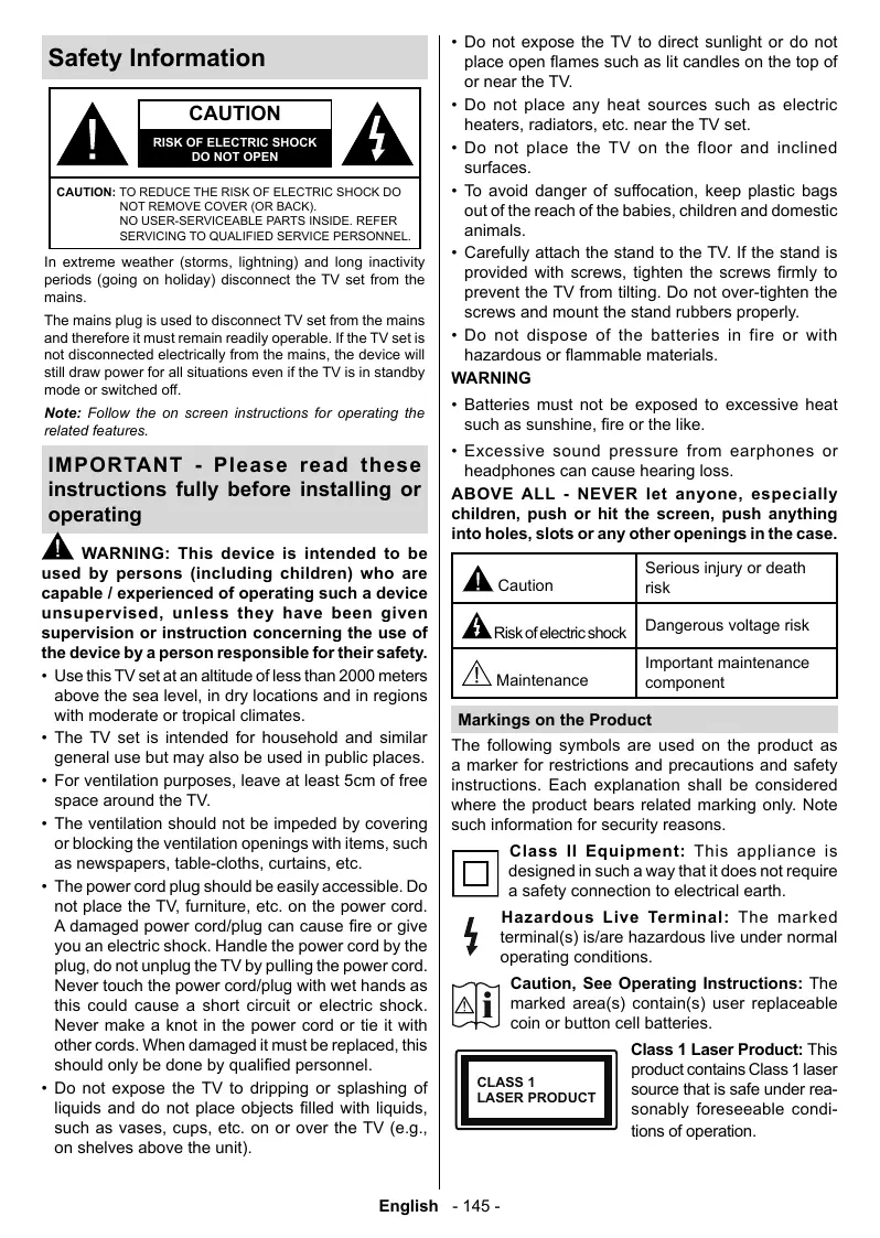 + Use this TV setat an altitude ofless than 2000 meters above the sea level, in dry locations and in regions with moderate or tropical climates.
