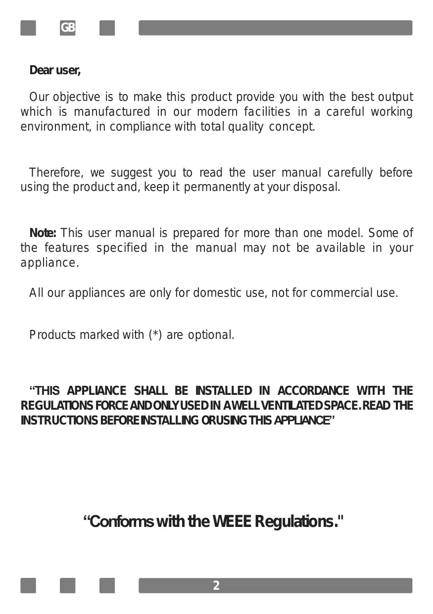 BC CE Dear user, Our objective is to make this product provide you with the best output which is manufactured in our modern facilities in a careful working environment, in compliance with total quality concept. Therefore, we suggest you to read the user manual carefully before using the product and, keep it permanently at your disposal. Note: This user manual is prepared for more than one model. Some of the features specified in the manual may not be available in your appliance. All our appliances are only for domestic use, not for commercial use. Products marked with (*) are optional. “THIS APPLIANCE SHALL BE INSTALLED IN ACCORDANCE WITH THE REGULATIONS FORCE AND ONLY USED IN AWELL VENTLATED SPACE. READ THE