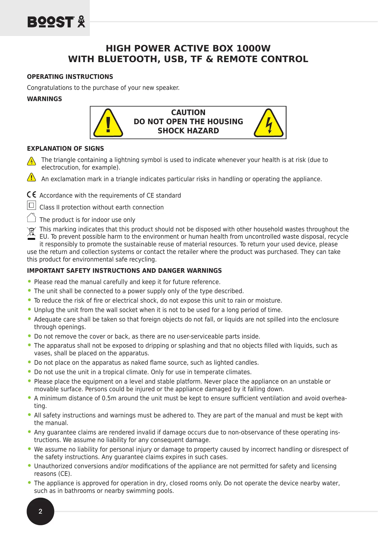 En conformité avec les exigences de la norme CE Appareil de classe II, double isolation sans mise à la terre