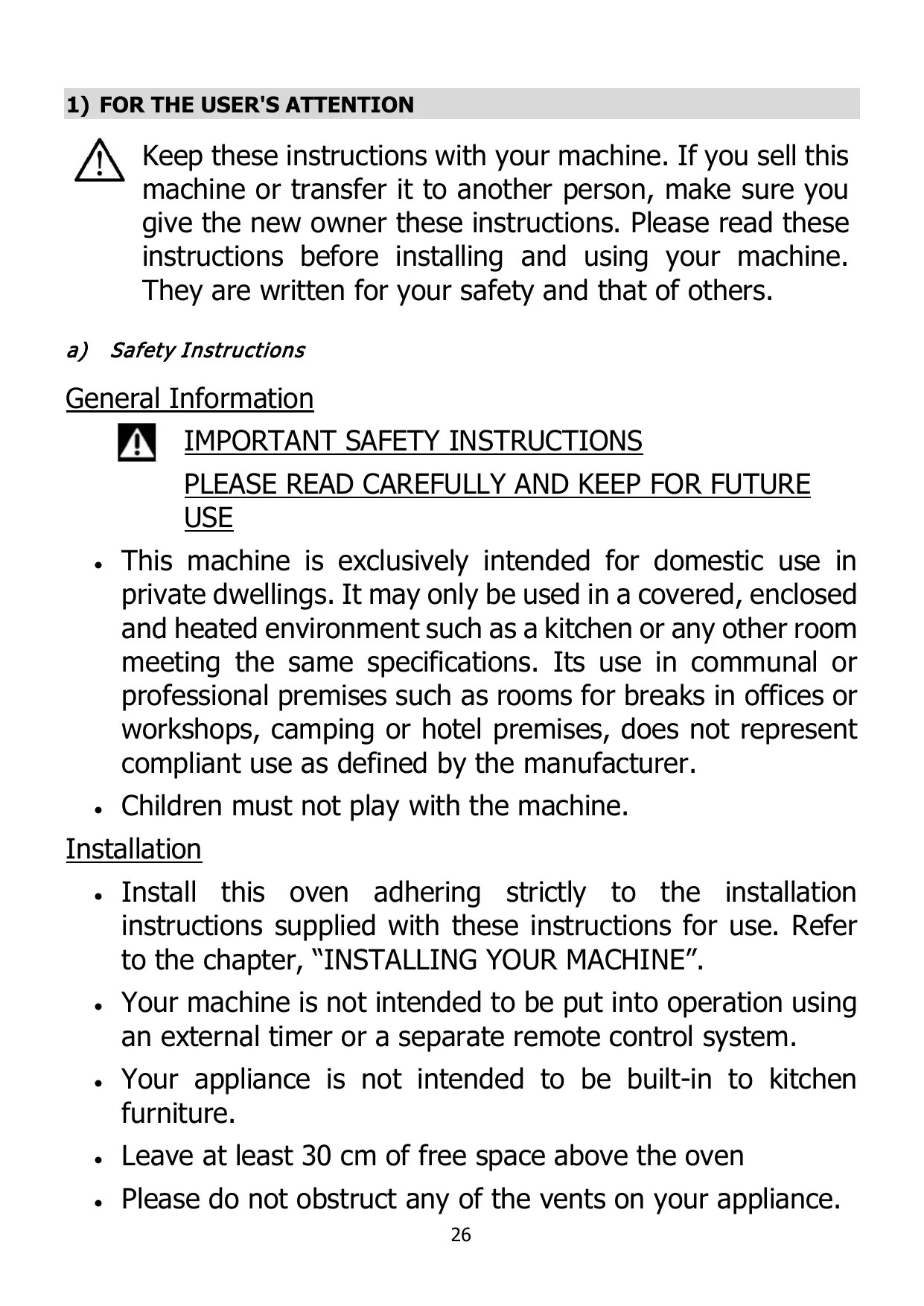 1) FOR THE USER'S ATTENTION VAN Keep these instructions with your machine. If you sell this