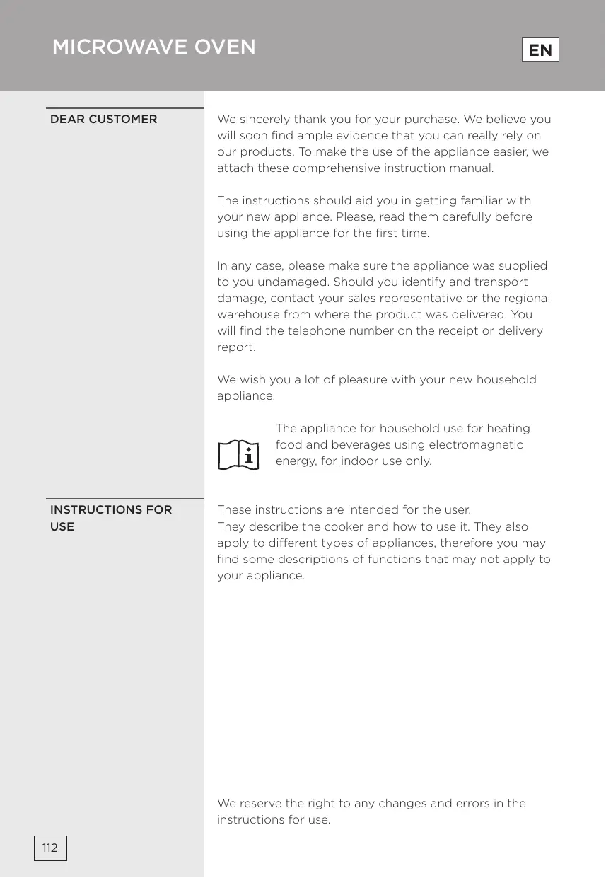 Si ce n'est pas le cas, retirez la fiche de la prise secteur, attendez 10 secondes et rebranchez le four convenablement. b) Vérifiez si le fusible n'a pas sauté ou si le disjoncteur n'a pas disjoncté. S'ils fonctionnent normalement, testez la prise murale en y raccordant un autre appareil 2. Sile four ne fonctionne pas en mode micro-ondes: a) Vérifiez si la durée de cuisson à été réglée b) Vérifiez si la porte est bien fermée et si le verrouillage est enclenché. Dans le cas contraire, le flux des micro-ondes ne peut pas parvenir dans le four. Si le four ne fonctionne toujours pas une fois que les vérifications ci-dessus ont été effectuées, contactez le service après-vente. Cet appareil ménager destiné à la cuisson des aliments et des boissons fonctionne avec des ondes électromagnétiques et doit être utilisé exclusivement à