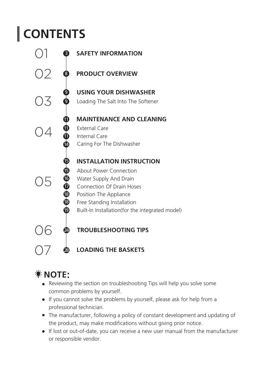 Wash Cycle Table Starting À Cycle Wash Changing The Program Mid-cycle Forget To Add A Dish? ERROR CODES TECHNICAL INFORMATION NOTE: e_lf you cannot solve the problems by yourself, please ask for help from a professional technician. + The manufacturer, following a policy of constant development and updating of the product, may make modifications without giving prior notice. e_f lost or out-of-date, you can receive a new user manual from the manufacturer or responsible vendor.