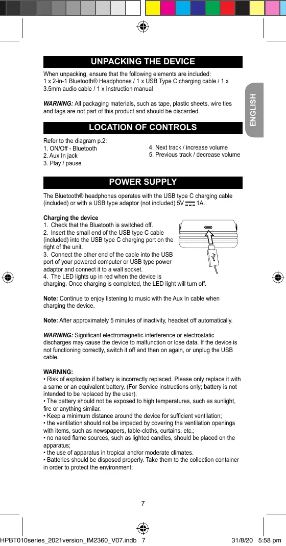 Lors du déballage, assurez-vous que les pièces suivantes soient incluses 1x Casque Bluetooth® 2 en 1 / 1 x Câble de charge USB type-C /