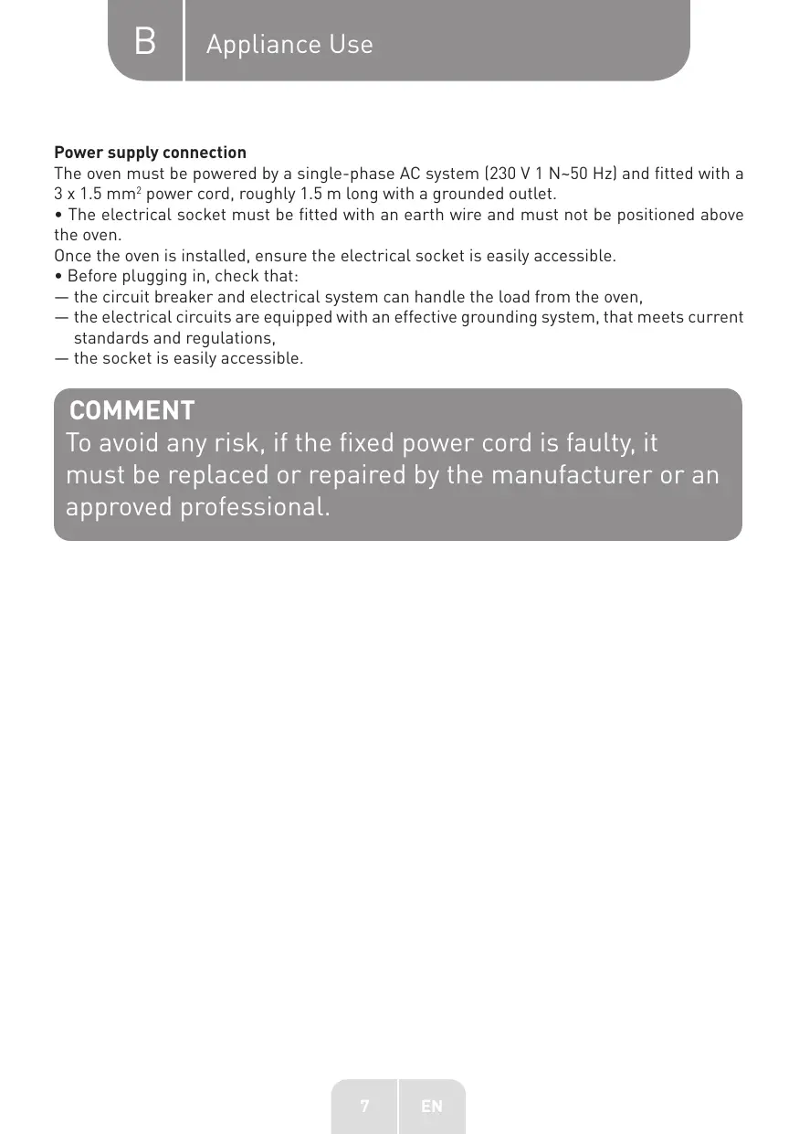 Appliance Use Power supply connection The oven must be powered by a single-phase AC system (230 V 1 N-50 Hz] and fitted with a 3 x 1.5 mm? power cord, roughly 1.5 m long with a grounded outlet. + The electrical socket must be fitted with an earth wire and must not be positioned above the oven. Once the oven is installed, ensure the electrical socket is easily accessible. + Before plugging in, check that: — the circuit breaker and electrical system can handle the Load from the oven, — the electrical circuits are equipped with an effective grounding system, that meets current standards and regulations, — the socket is easily accessible. COMMENT To avoid any risk, if the fixed power cord is faulty, it must be replaced or repaired by the manufacturer or an approved professional.