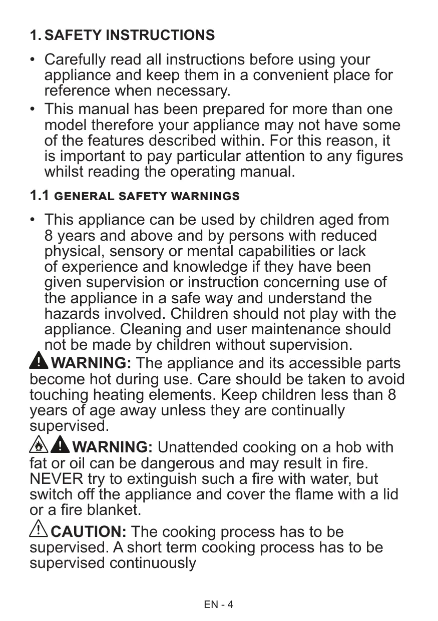 ATTENTION : Cet appareil sert uniquement à des fins de cuisson et est destiné uniquement à un usage domestique. Il ne doit pas être utilisé à d’autres fins, par exemple le chauffage du local, ou un usage commercial.