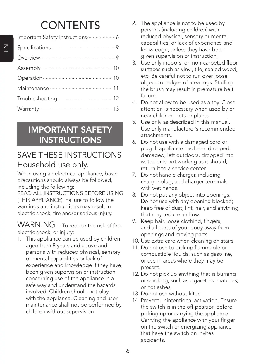 - Use only indoors, on non-carpeted floor surfaces such as vinyl, tile, sealed wood, etc. Be careful not to run over loose objects or edges of area rugs. Stalling the brush may result in premature belt failure.