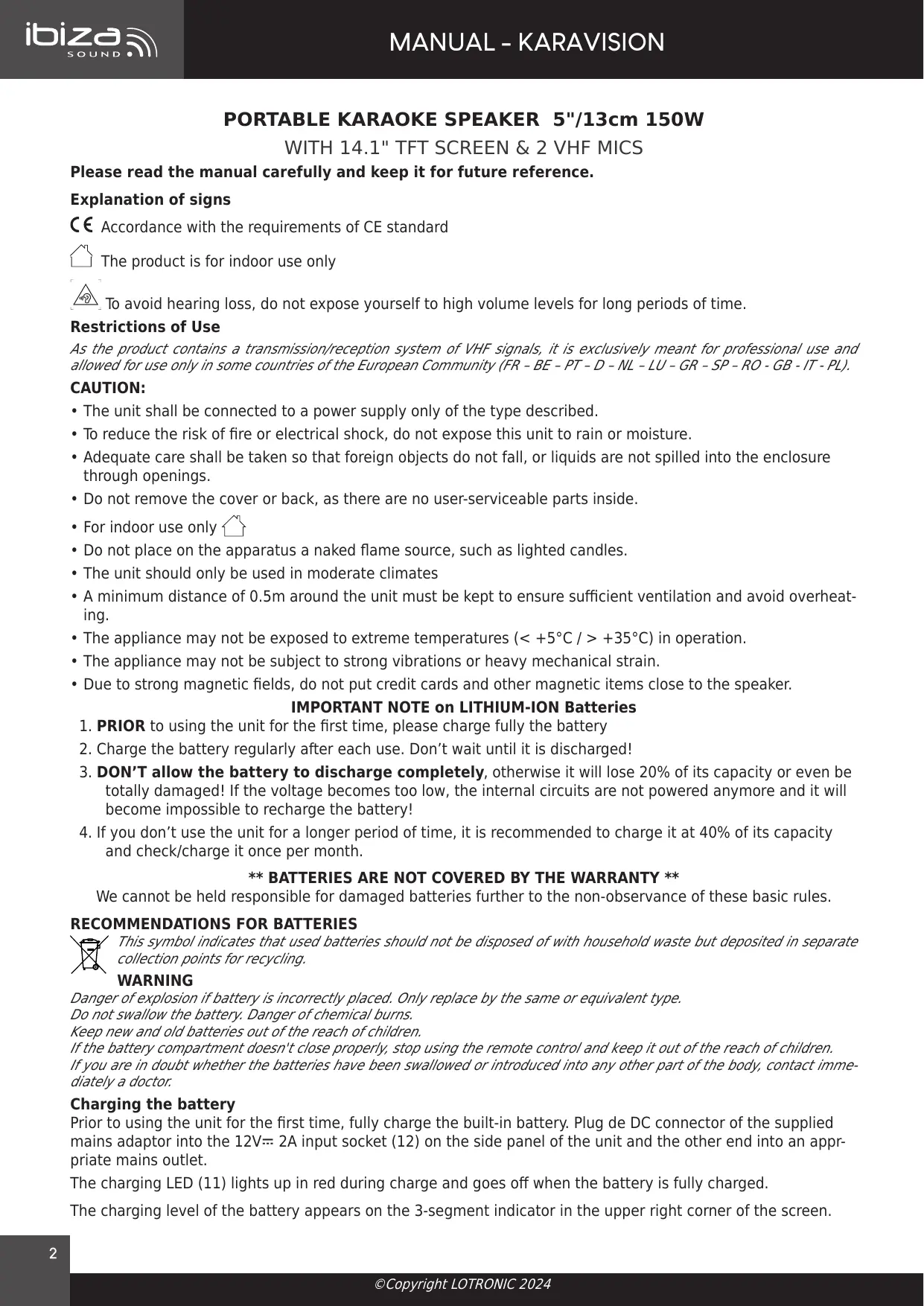 ibizS \ MANUAL - KARAVISION SOUND PORTABLE KARAOKE SPEAKER 5"/13cm 150W WITH 14.1" TFT SCREEN & 2 VHF MICS Please read the manual carefully and keep it for future reference.