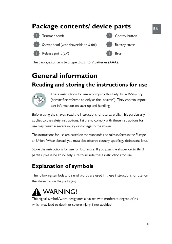 Conserver ces instructions d'utilisation pour des utilisations futures. Si vous trans- mettez le rasoir à des tiers, joignez obligatoirement ces instructions d'utilisation.
