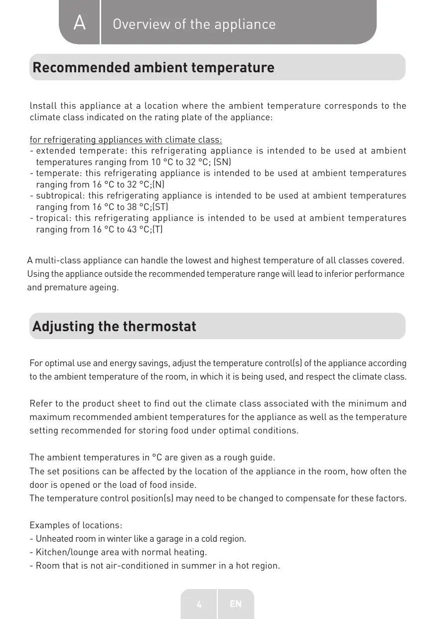 Pour un usage optimal et des économies d'énergie, iLest recommandé de régler le(s) thermostat(s] de l'appareil selon la température ambiante de la pièce d'utilisation et Le respect de La classe climatique.