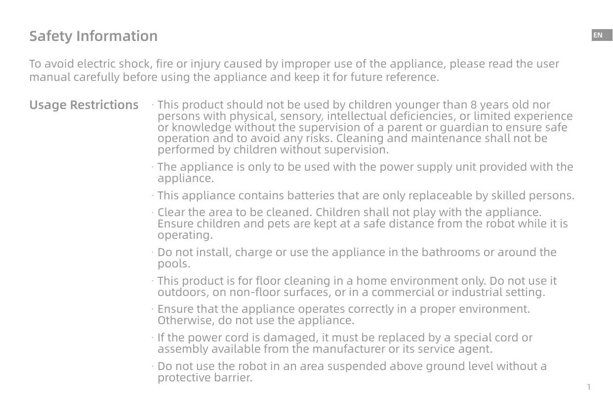 Pendant le nettoyage, assurez-vous que les enfants et les animaux de compagnie sont maintenus à une distance de sécurité du robot aspirateur.
