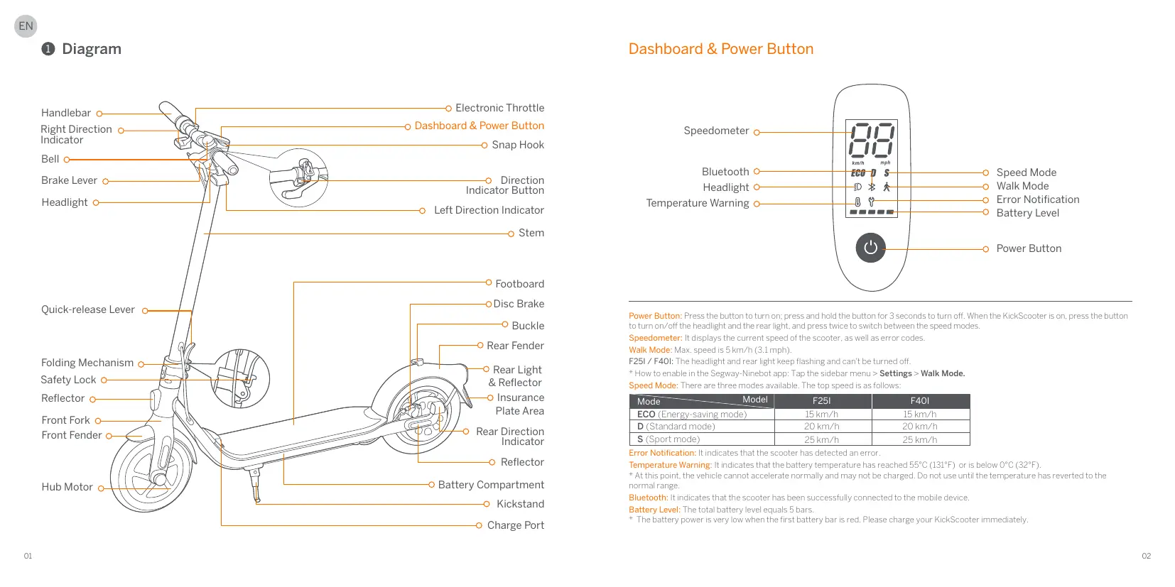 Speedometer: I displays the current speed of the scooter, as well as error codes.